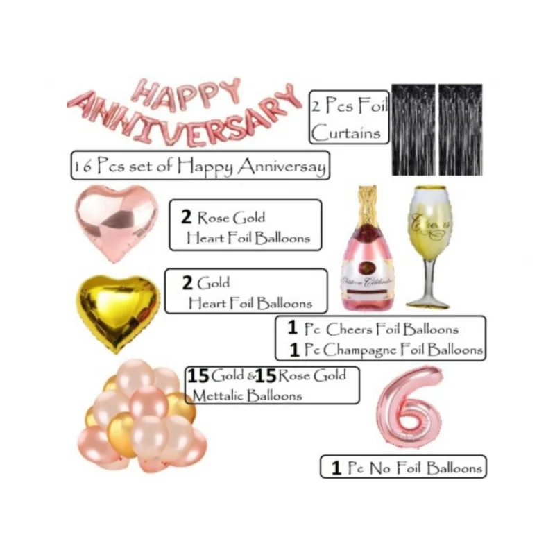 ? Package Contains: 1 Happy Anniversary Rose Gold Foil 30 HD Metallic Rose Gold & Gold Balloons 2 Rose Gold Heart shape Foil Balloons + 2 Gold Heart Shape Foil Balloons 1 Pc Cheers Foil Balloon & 1 pc Rose Gold Foil Balloon + 2 Black Foil Fringe Curtain ,Rose gold Selective foil number