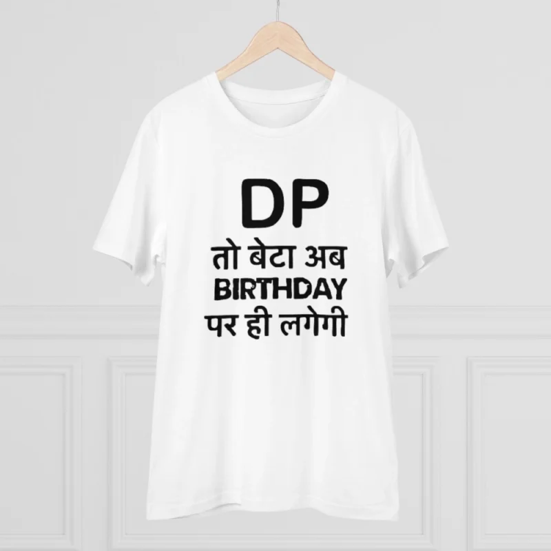 Men’s PC Cotton Dp To Ab Birthday Par Hi Lagegi Printed T Shirt (Color: White, Thread Count: 180GSM)