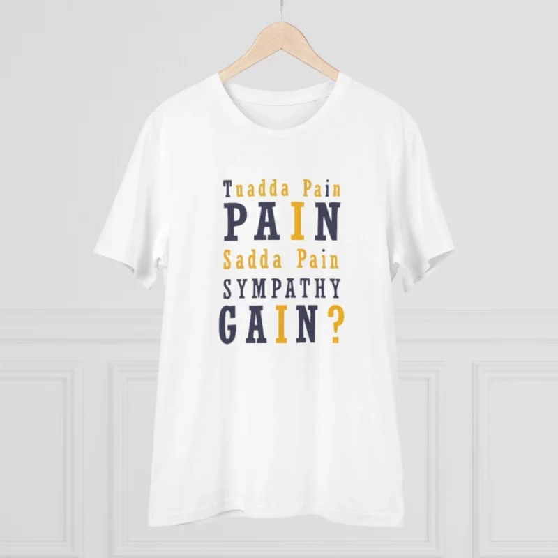 Men’s PC Cotton Tuadda Pain Pain Sadda Pain Sympathy Gain Printed T Shirt (Color: White, Thread Count: 180GSM)