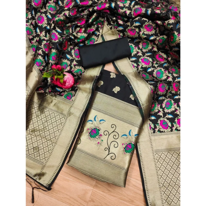 Women’s Banarasi Silk Printed Unstitched Salwar Suit Material With Dupatta (Black, 3Mtrs)