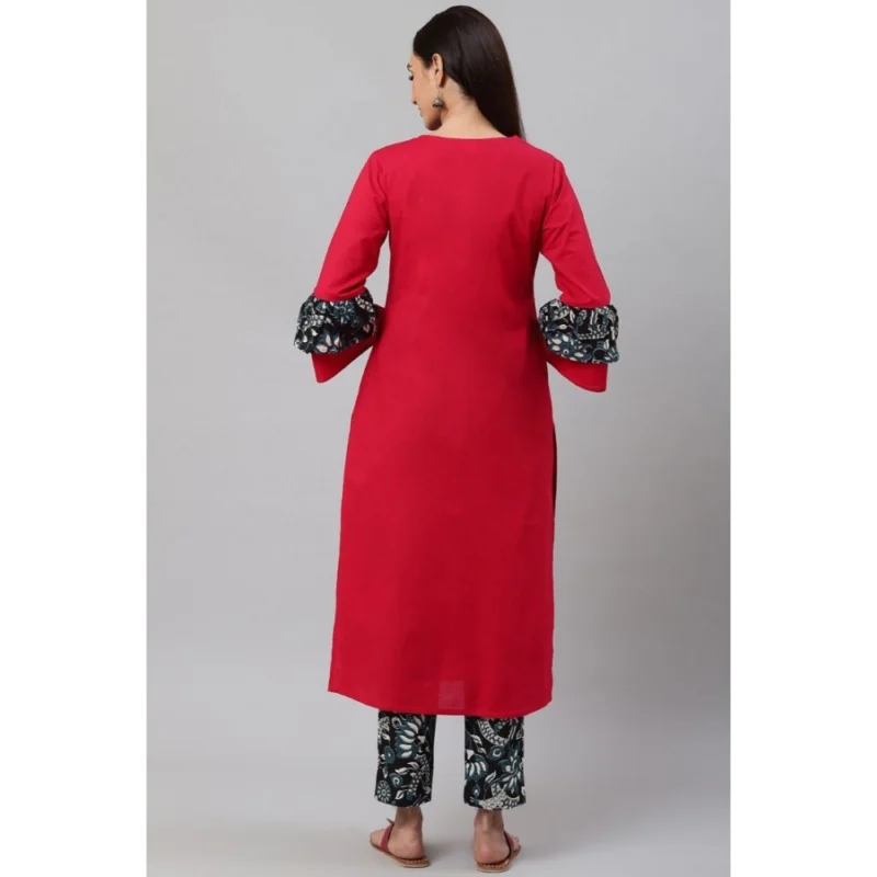 Women’s Casual Bell Sleeves Floral Printed Cotton Kurti Set (Rani Pink)