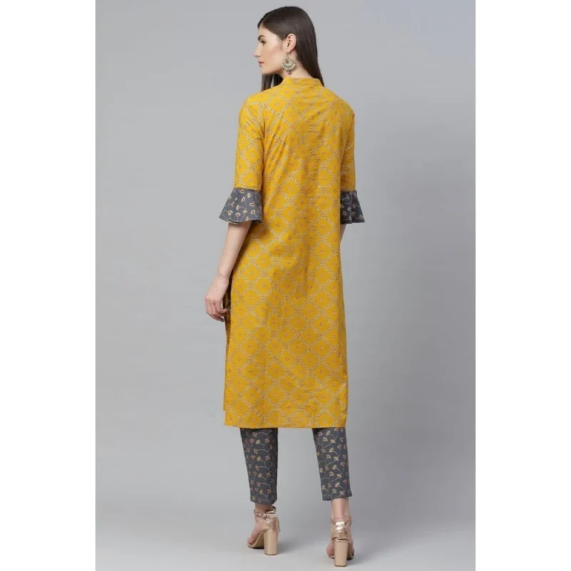 Women’s Casual Bell Sleeves Geomatrical Printed Cotton Kurti Set