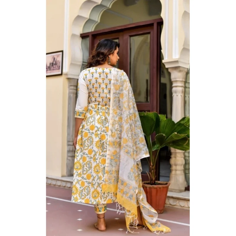 Women’s Cotton Blend Printed Work Kurti With Bottom And Dupatta Set (Yellow)