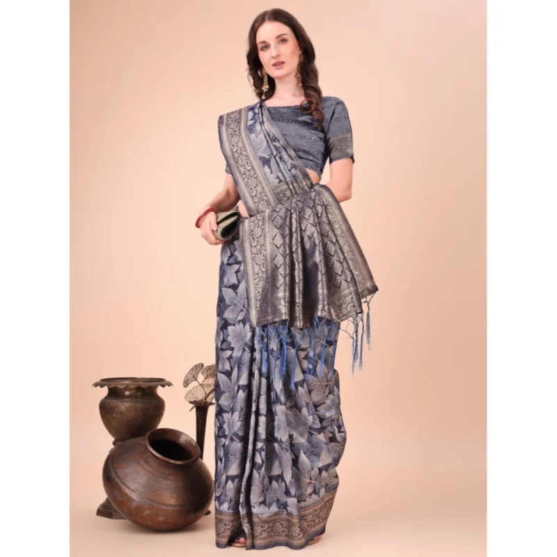 Women's Cotton Printed Saree With Unstitched Blouse 5.5Mtr (Navy Blue)