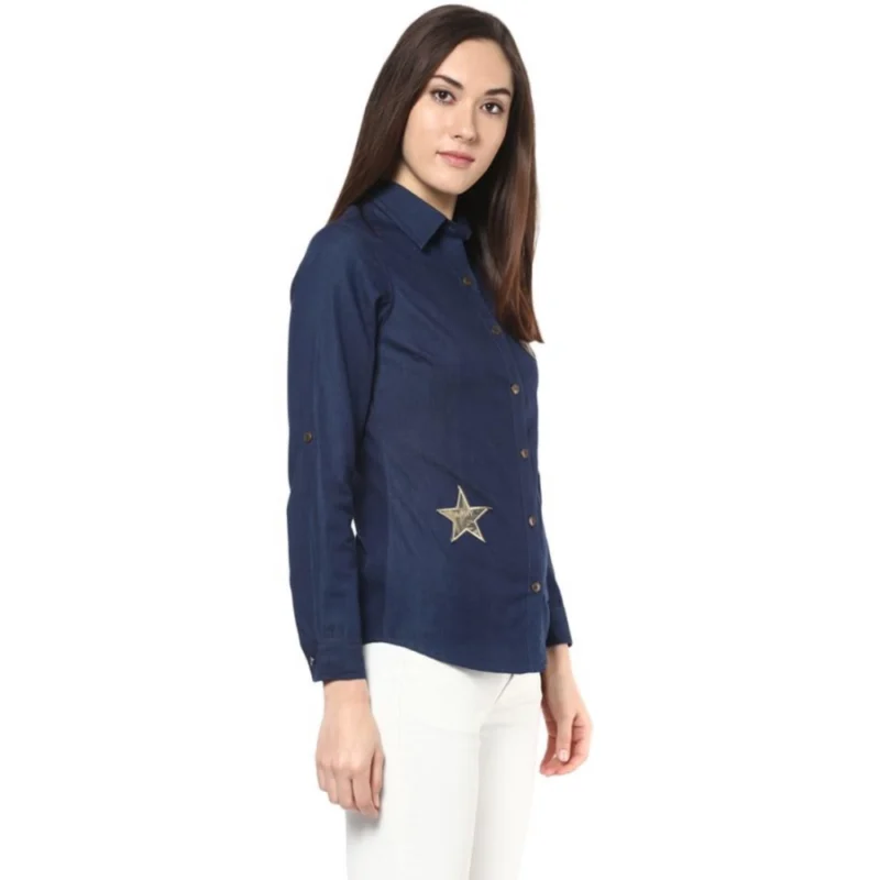 Women's Denim Patch Work Long Sleeves Standard Length Shirt (Blue)