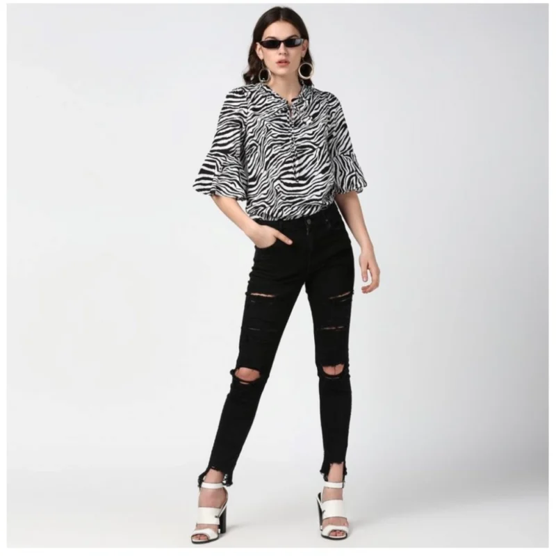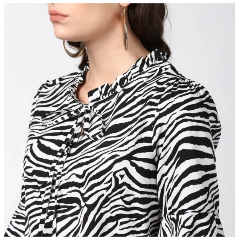 Women’s Polyester Animal Print Bell Sleeve Top (Black – White)