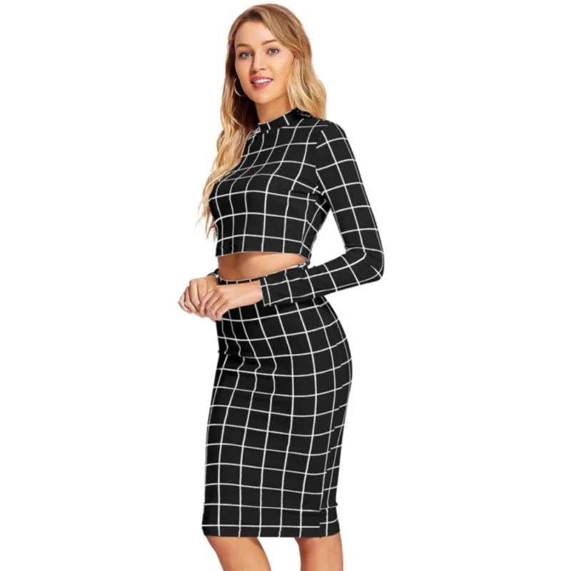 Women’s Polyester Checkered Full Sleeves Stand Collar Crop Top Skirt Set