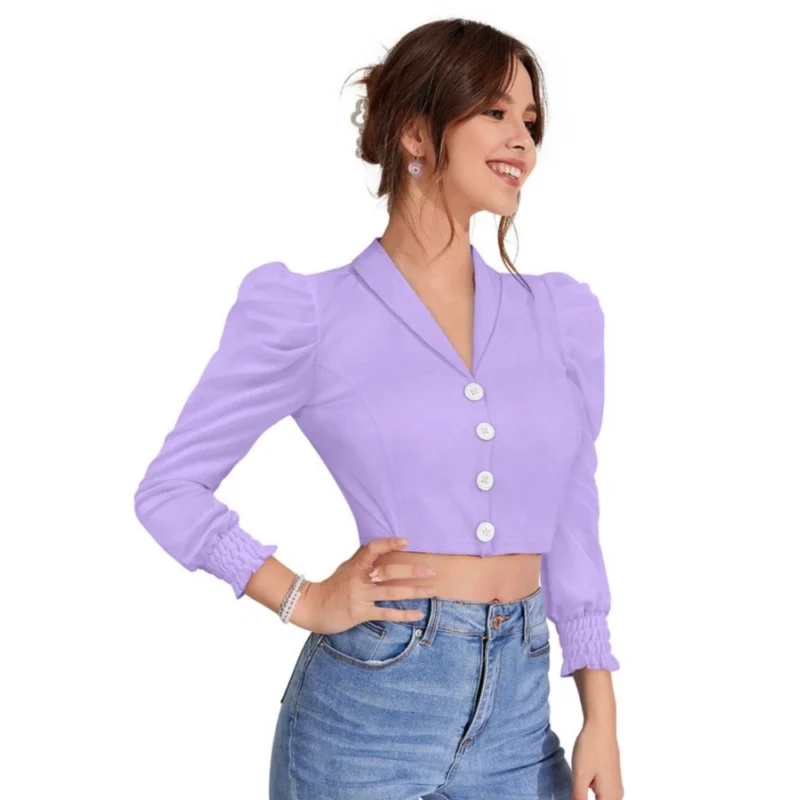 Women’s Polyester Solid Puff Sleeves Lapel Collar Top (Purple)