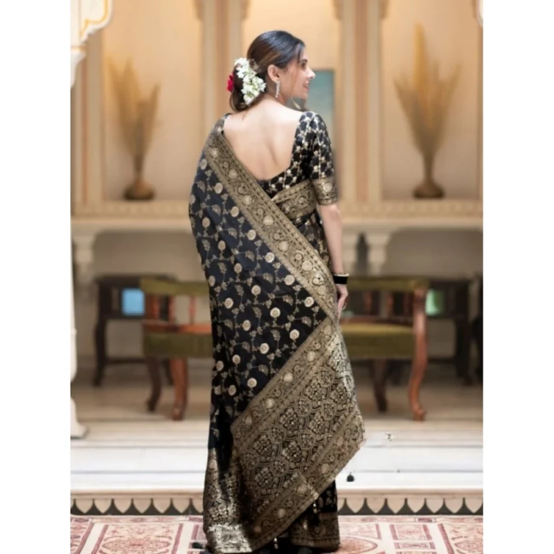 Women's Silk Printed Saree With Unstitched Blouse 5.5Mtr (Black)
