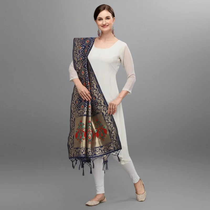 Women’s Silk Pure Zari weaving Duppatta (Navy Blue, Length: 2-2.3 Mtrs)