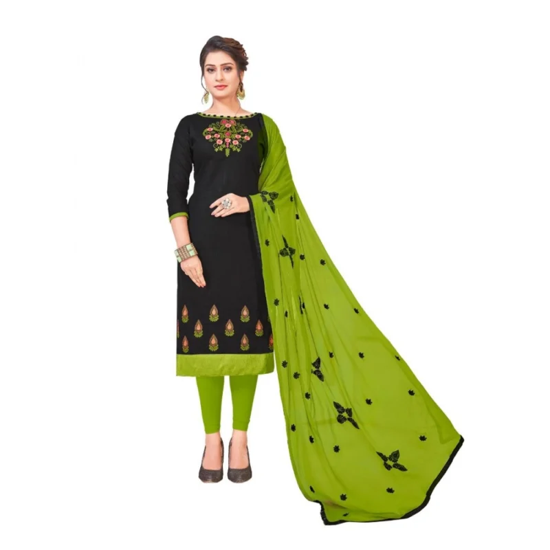 Women’s Slub Cotton Unstitched Salwar-Suit Material With Dupatta (Black, 2 Mtr). <br>Top Fabric: Slub Cotton, Bottom Fabric: Cotton, Dupatta Fabric: Chiffon. <br>Top Color: Black, Bottom Color: Green, Dupatta Color: Green. <br>Top Length: 2 Mtr, Bottom Length: 2 Mtr, Dupatta Length: 2.20 Mtr. <br> Style: Embroidered<br>Disclaimer: The color of actual product may vary slightly from the images provided due to photographic lighting conditions and difference in screen resolutions.
