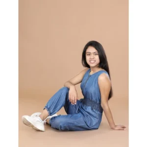 Girl’s Denim Solid Shoulder Straps V-Neck Dress