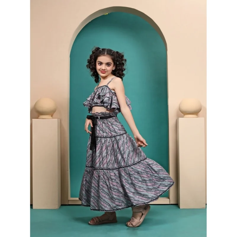 Girl’s Maslin Printed Crop Top And Fleared Skirt Set (Grey)