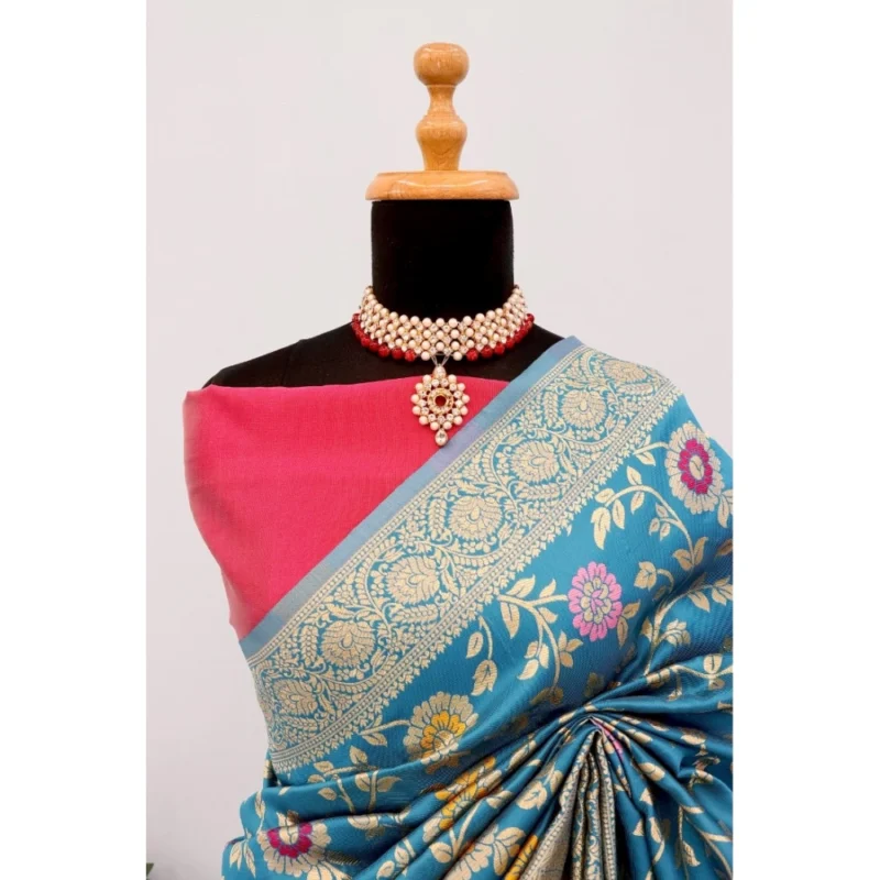 Women’s Banarasi Printed Saree With Unstitched Blouse 5.5Mtr (Aqua Blue)