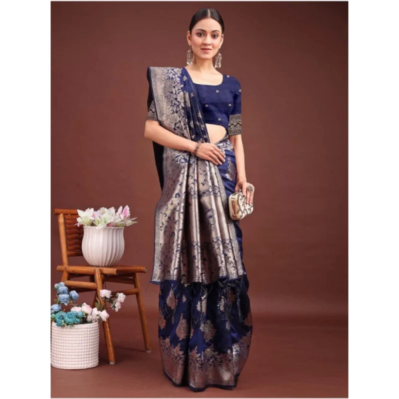 Women's Banarasi Silk Printed Saree With Unstitched Blouse 5.5Mtr (Navy Blue)