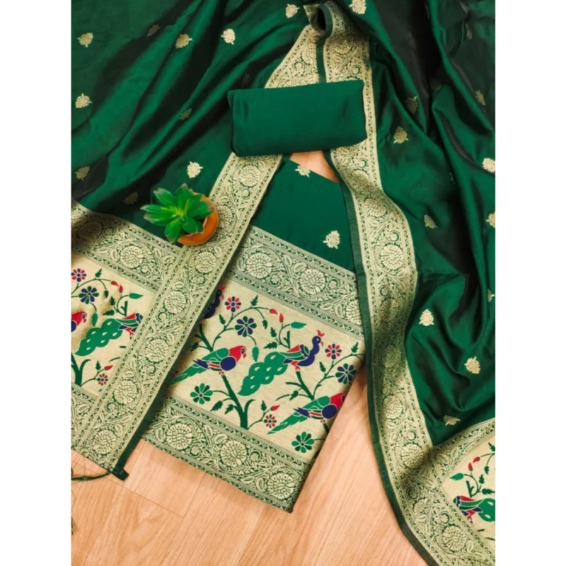 Women’s Banarasi Silk Printed Unstitched Salwar Suit Material With Dupatta (Bottle Green, 3Mtrs)