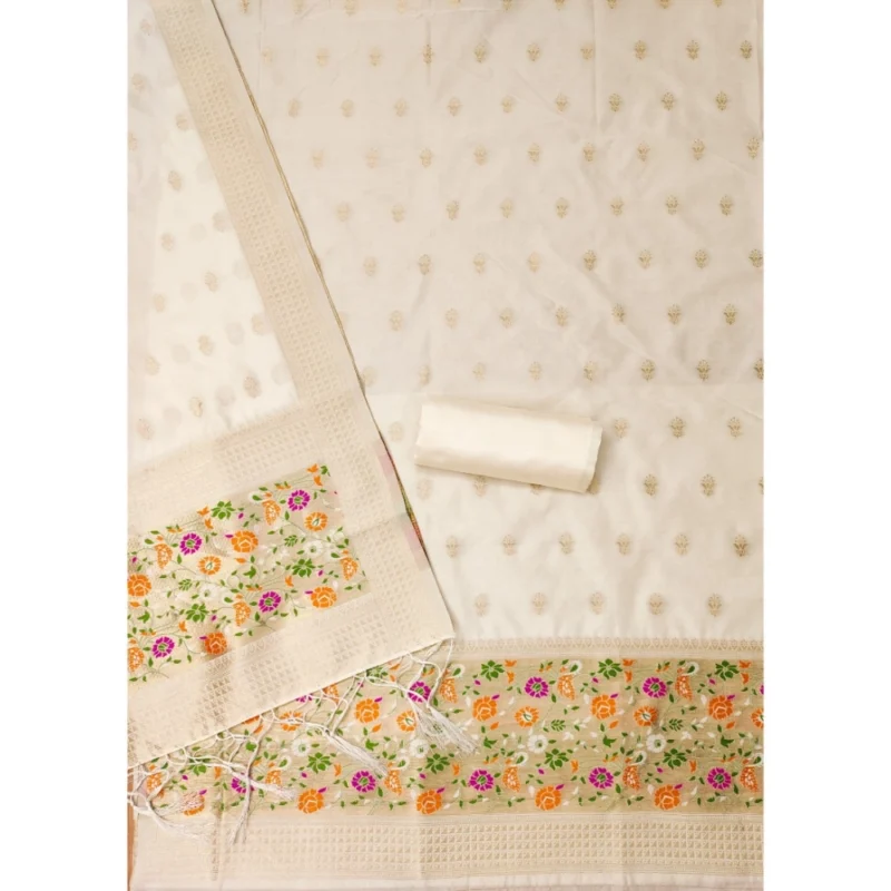 Women’s Banarasi Silk Printed Unstitched Salwar Suit Material With Dupatta (White, 3Mtrs)