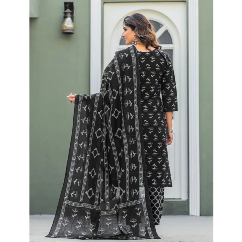 Women’s Cotton Blend Printed Kurti With Pant Dupatta Set (Black)