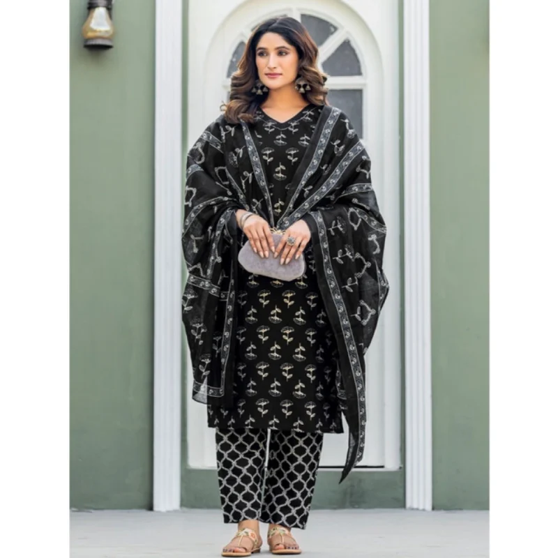 Women's Cotton Blend Printed Kurti With Pant Dupatta Set (Black)