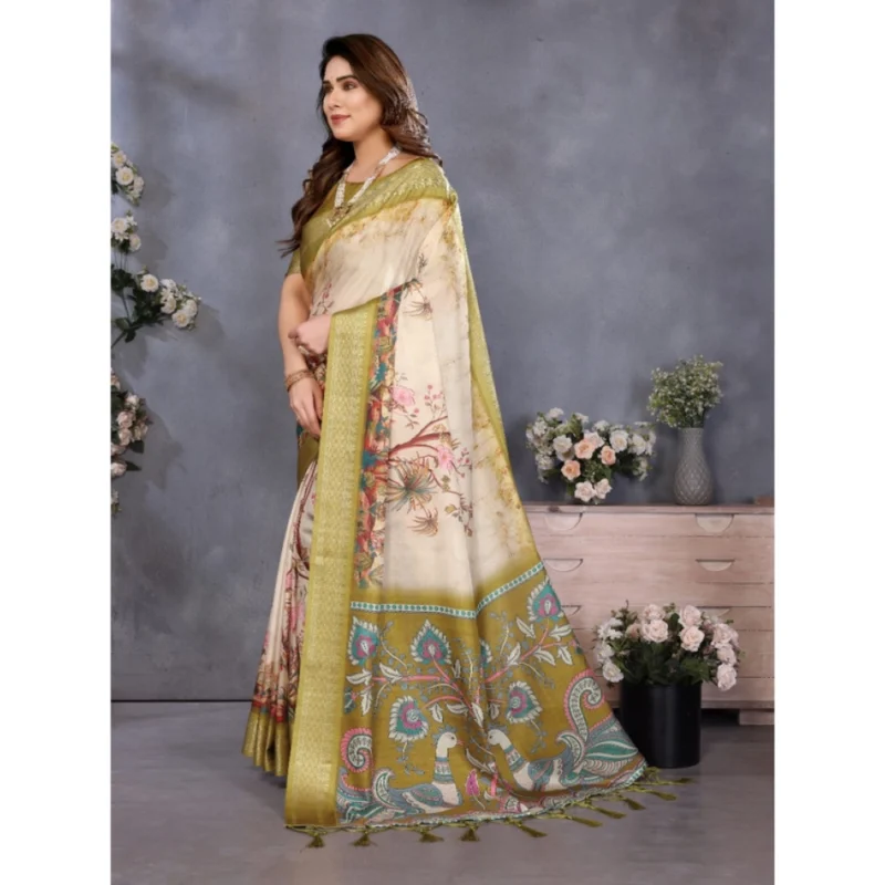 Women’s Cotton Silk Printed Saree With Unstitched Blouse 5.5Mtr (Olive Green)