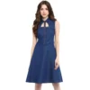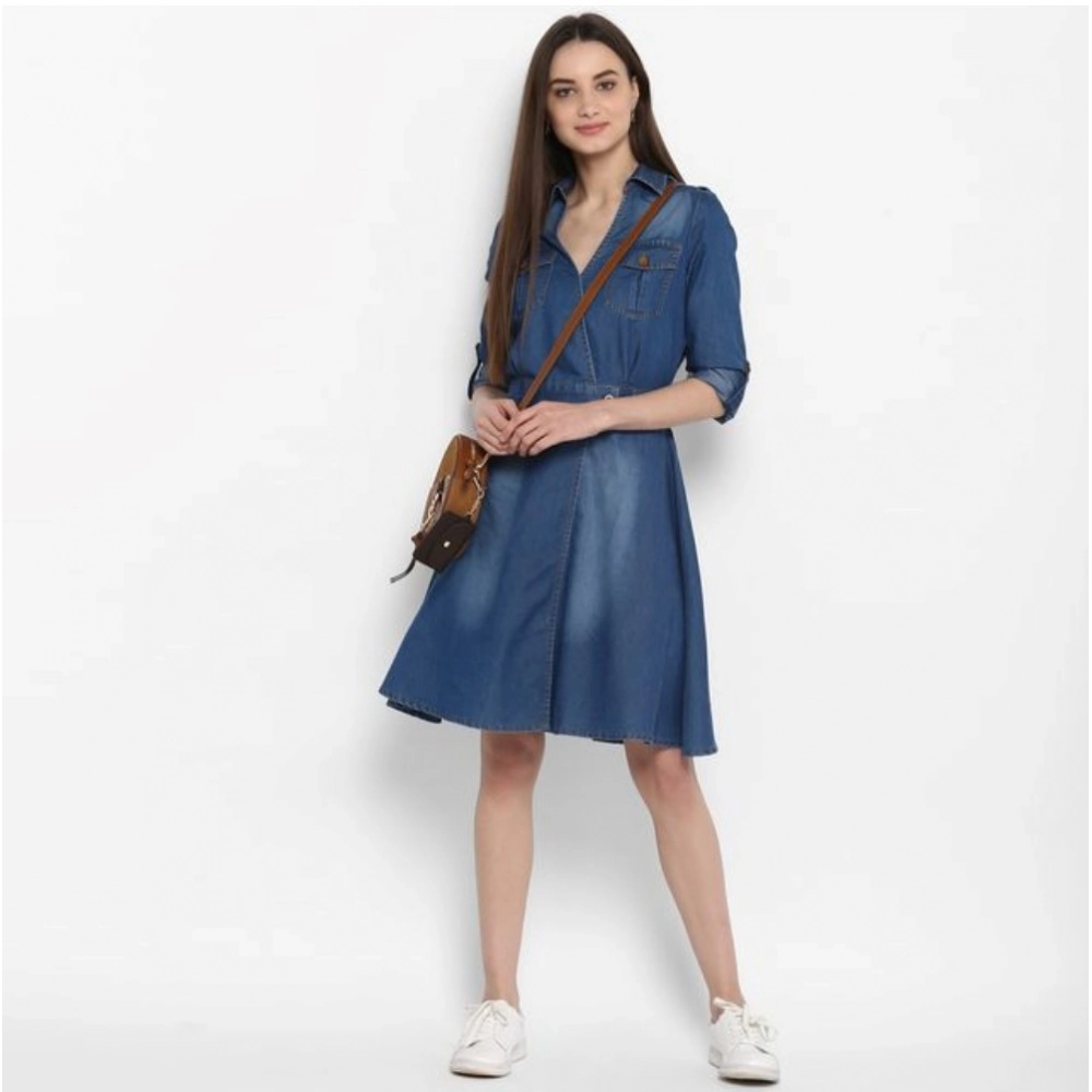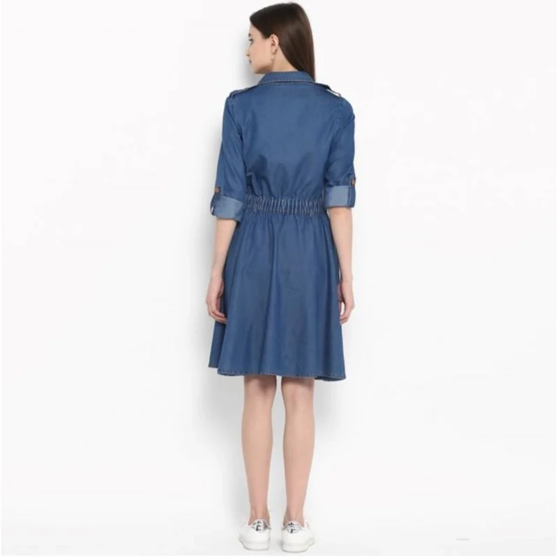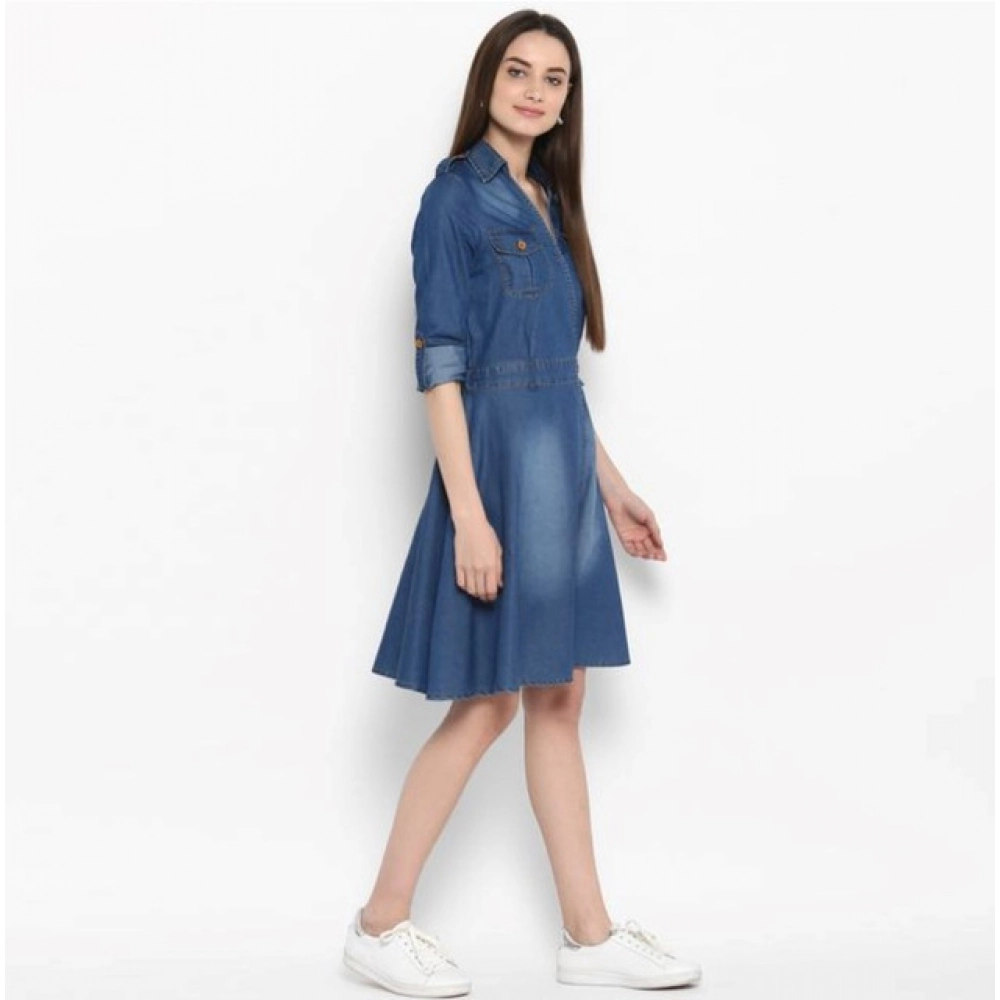 Women’s Denim Solid Roll Up Sleeve Dress (Blue)
