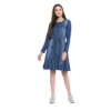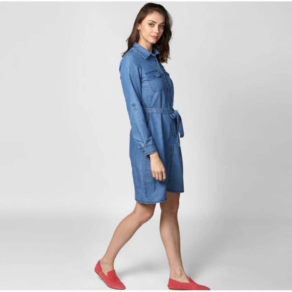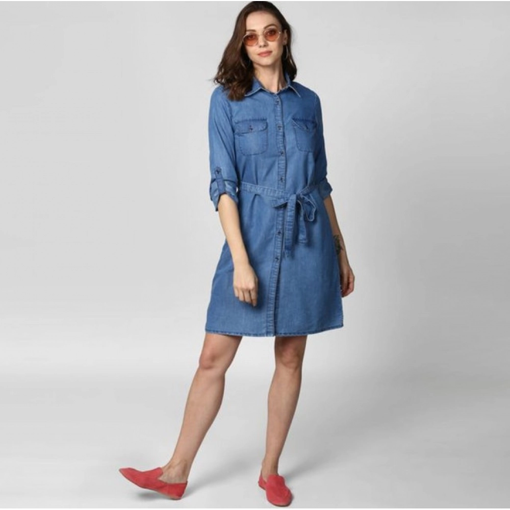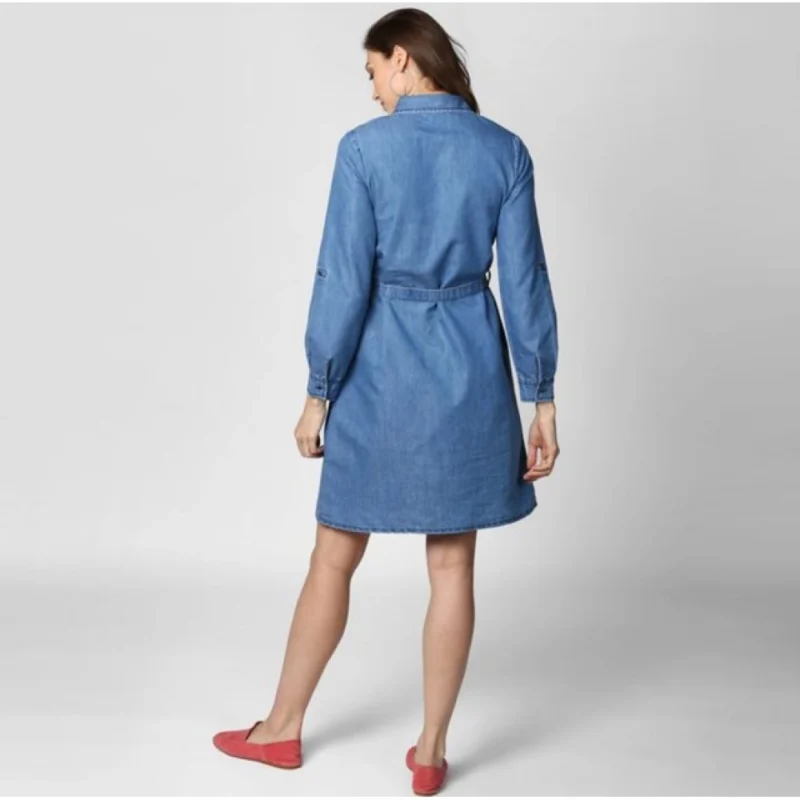 Women’s Denim Solid Roll Up Sleeve Dress (Blue)