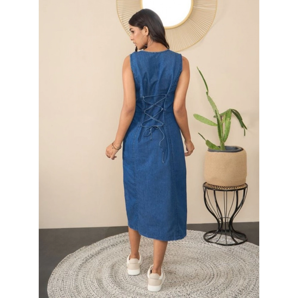 Women's Denim Solid Sleeveless Dress (Blue)