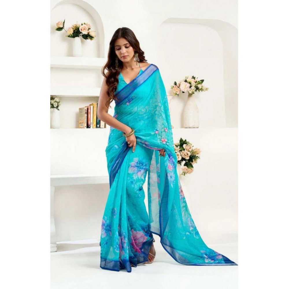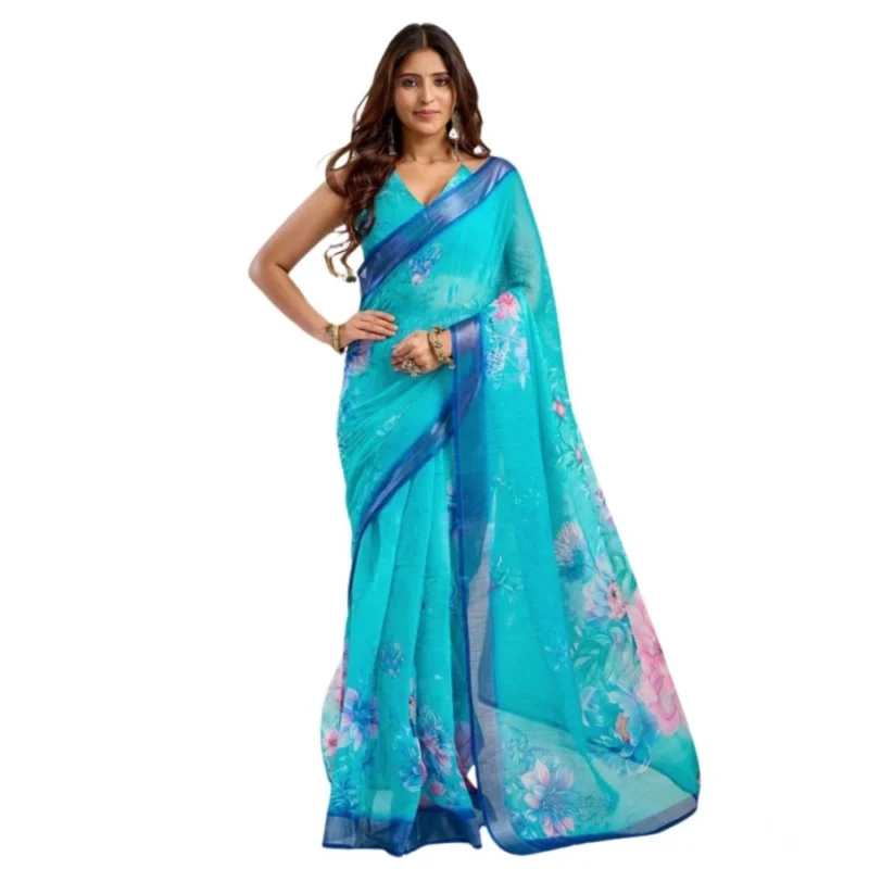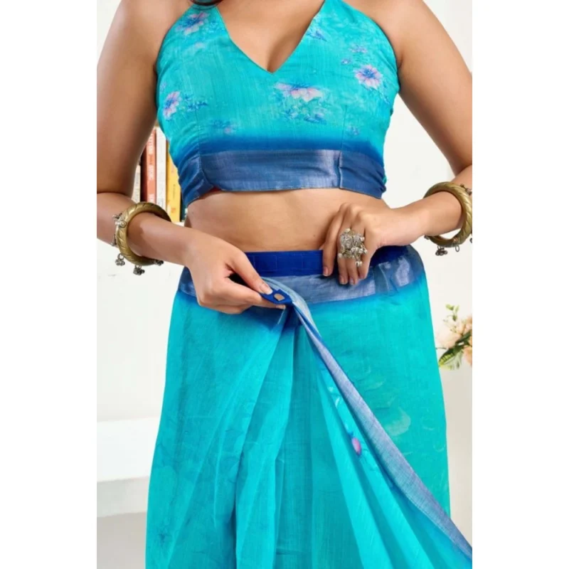 Women's Faux Linen Floral Print Ready to wear Saree With Unstitched Blouse 5.5Mtr (Light_AquaBlue)