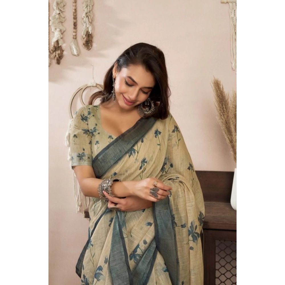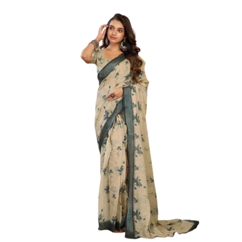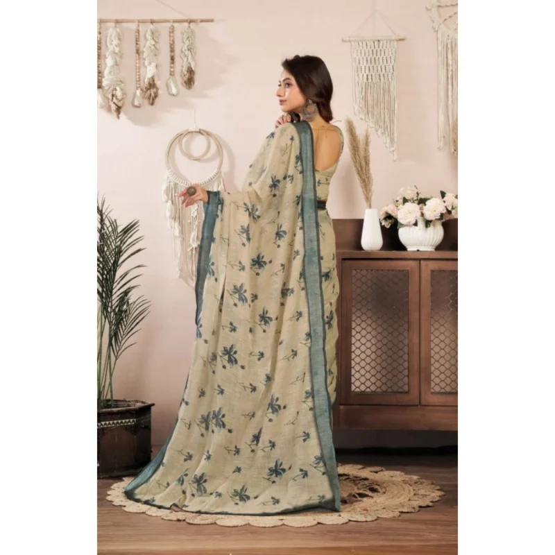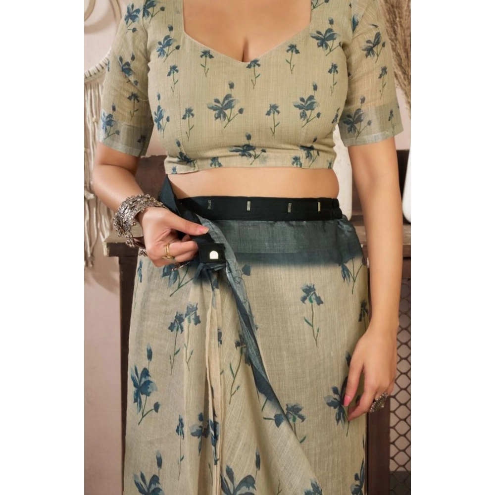 Women’s Faux Linen Floral Print Ready to wear Saree With Unstitched Blouse 5.5Mtr (LightBeige)