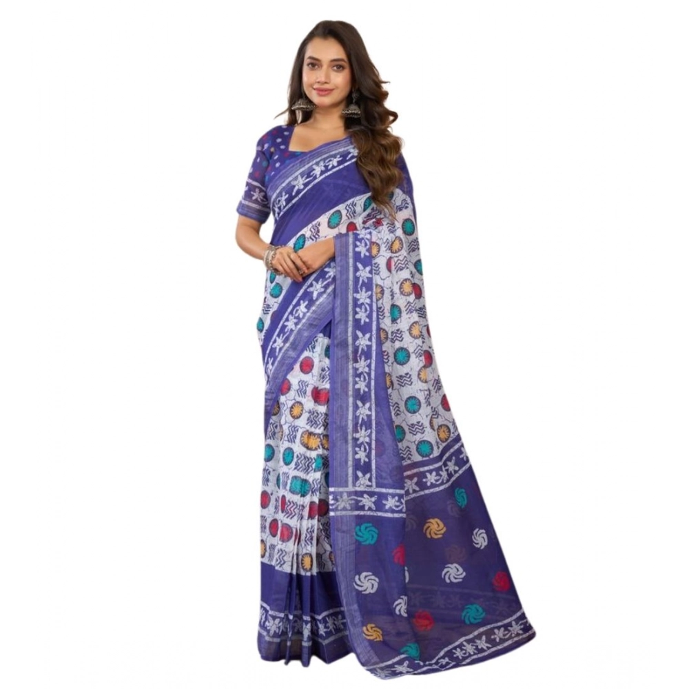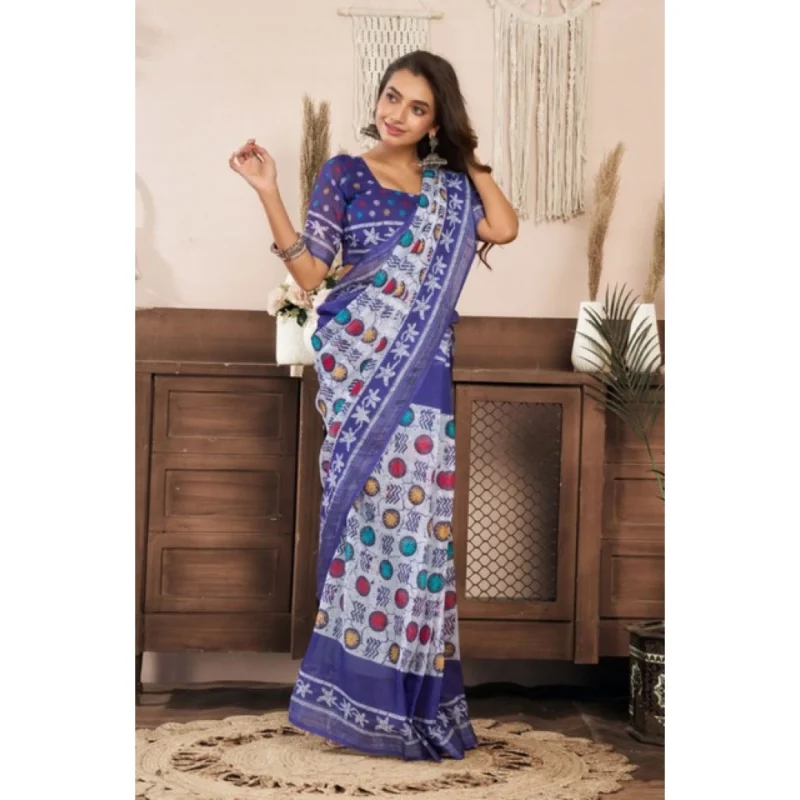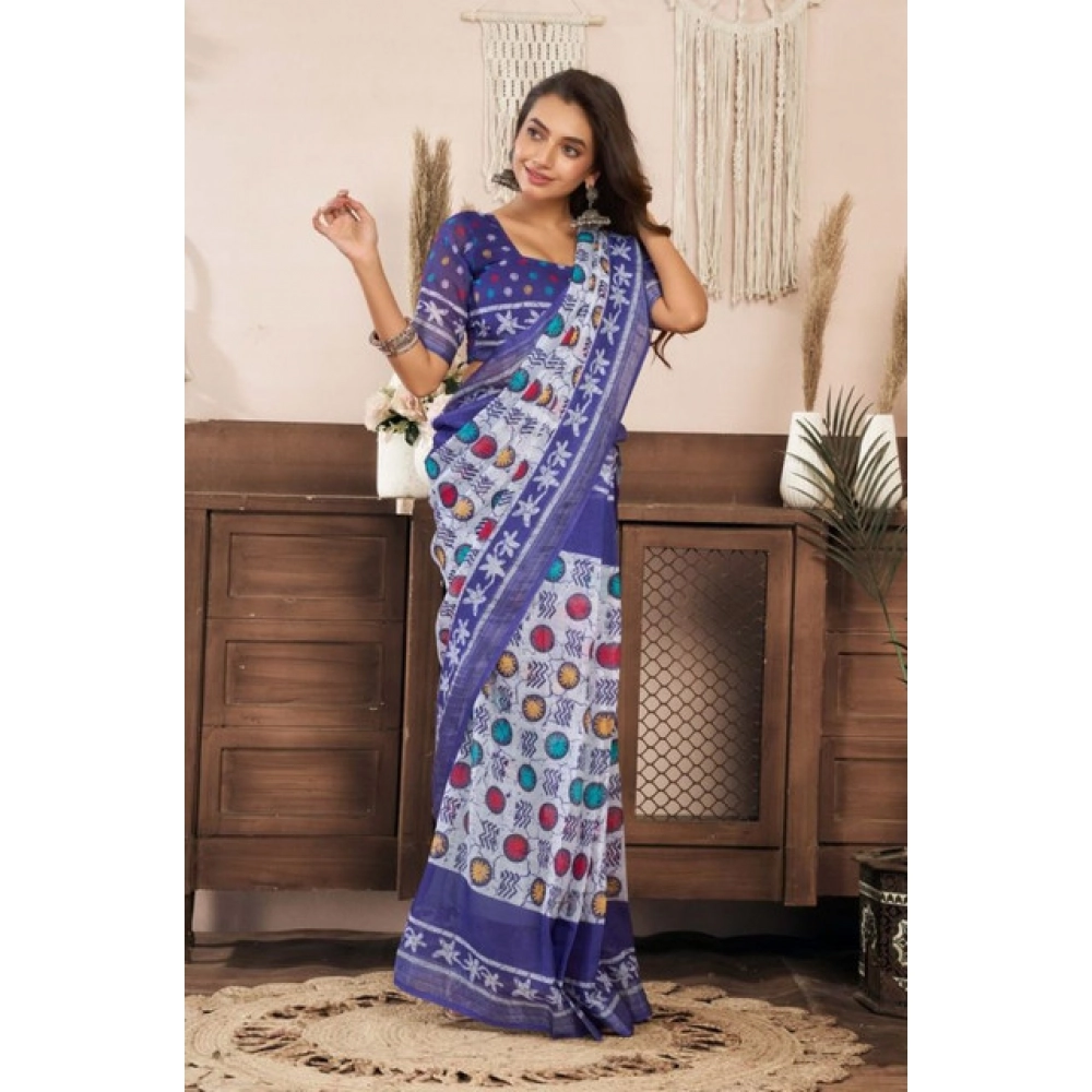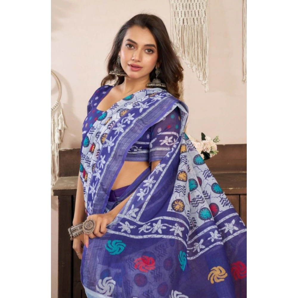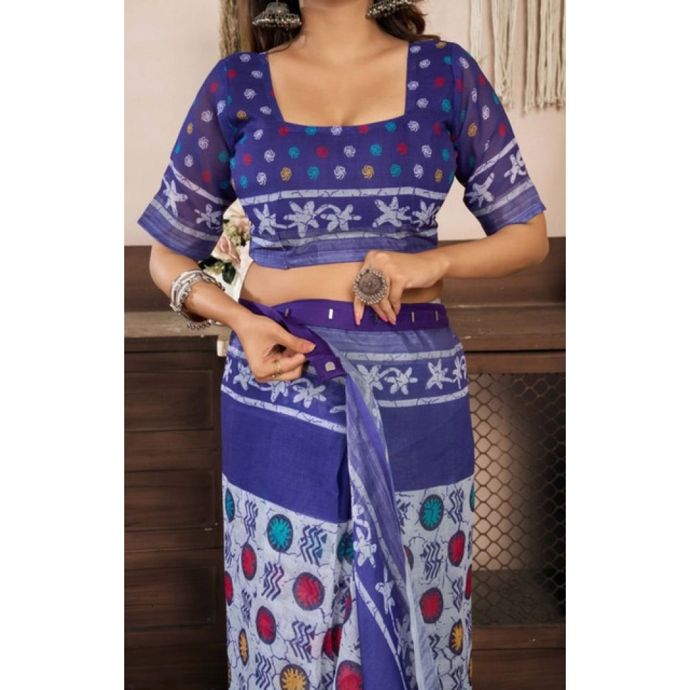 Women’s Faux Linen Geometric Print Ready to wear Saree With Unstitched Blouse 5.5Mtr (Blue)