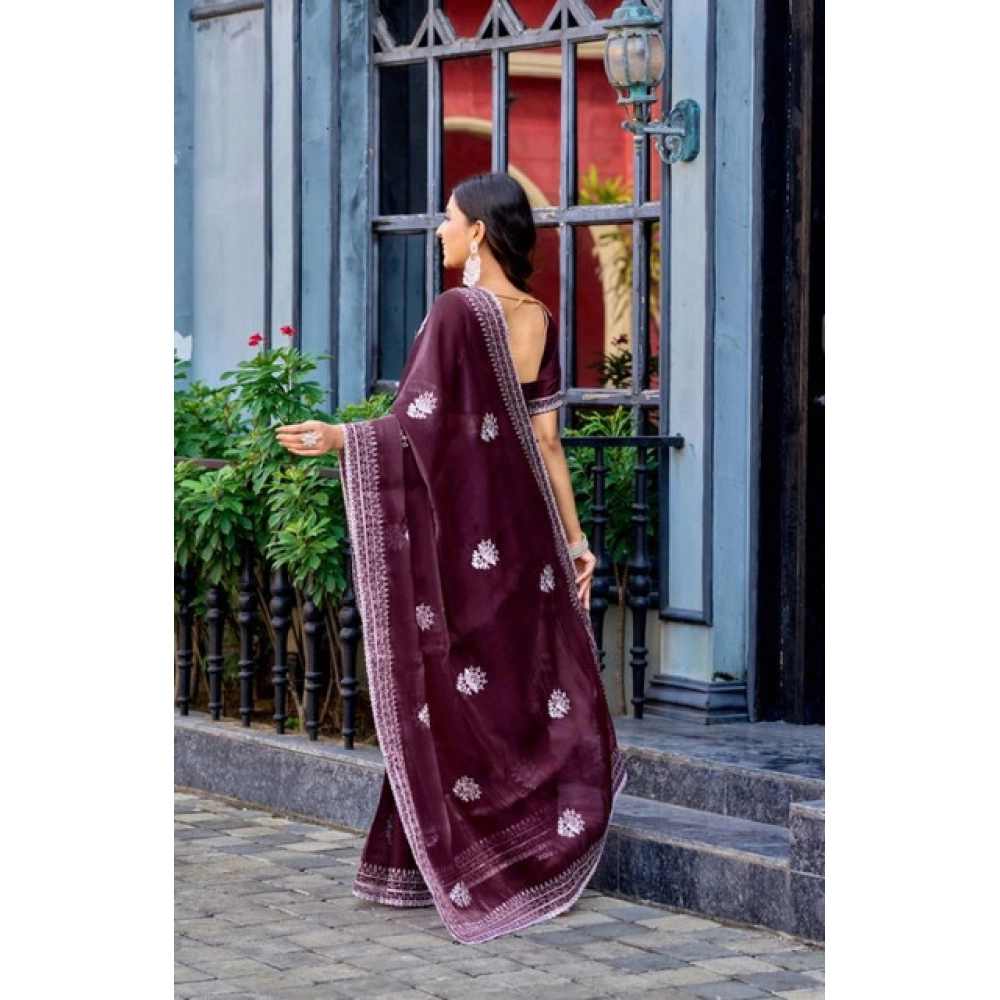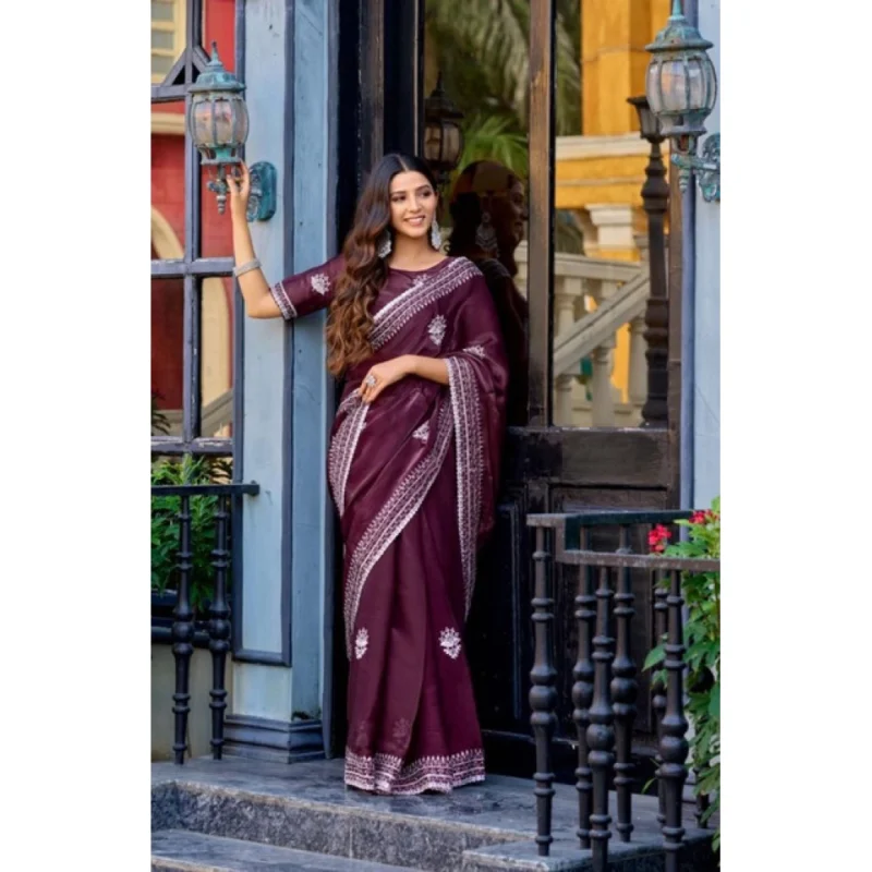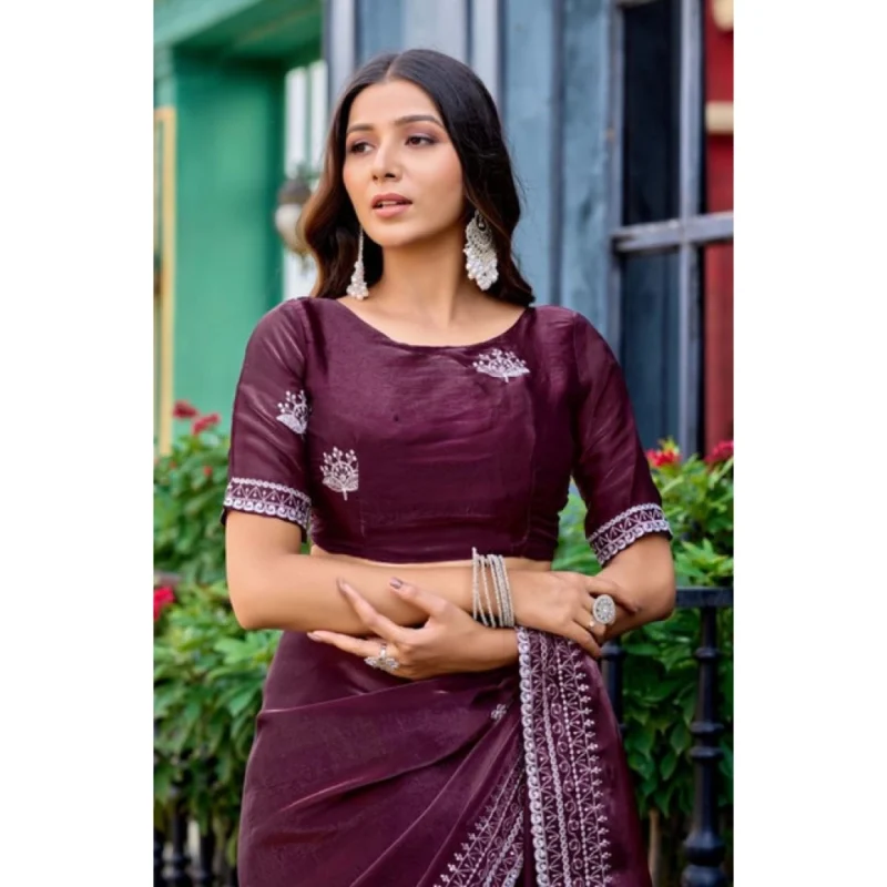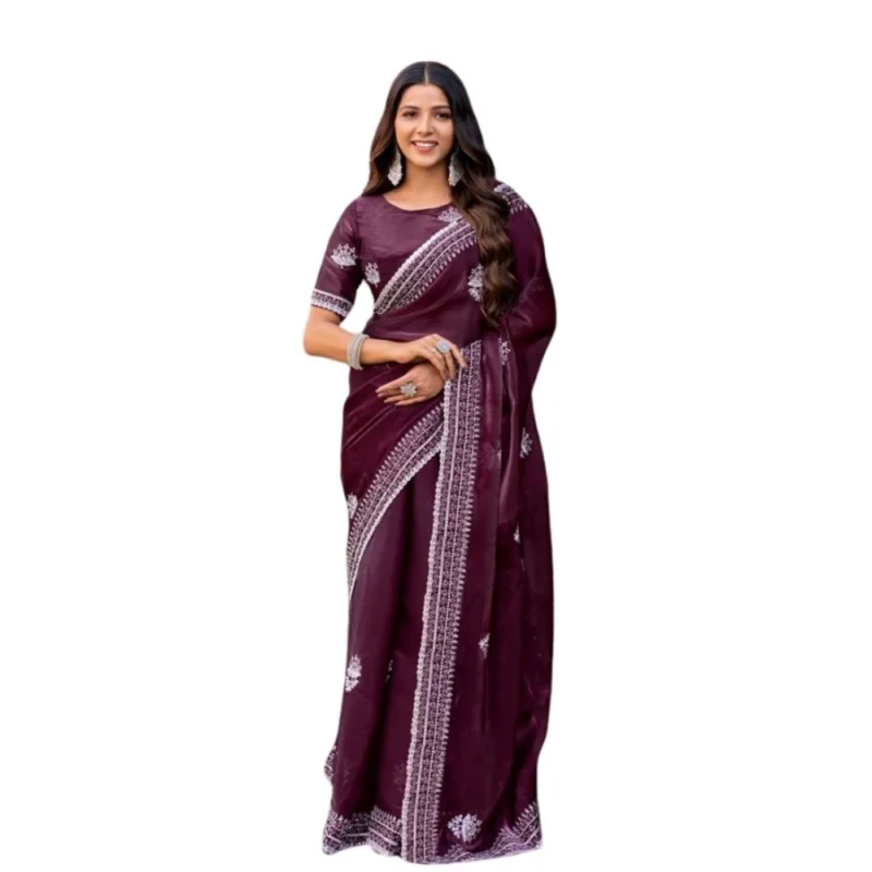 Women’s Faux Shimmer Floral Embroidery Ready to wear Saree With Unstitched Blouse 5.5Mtr