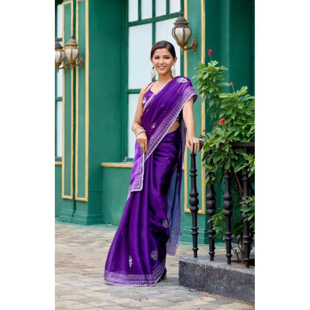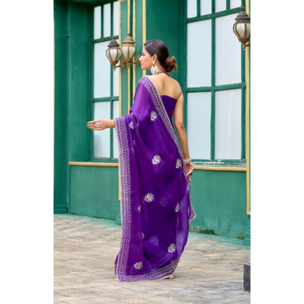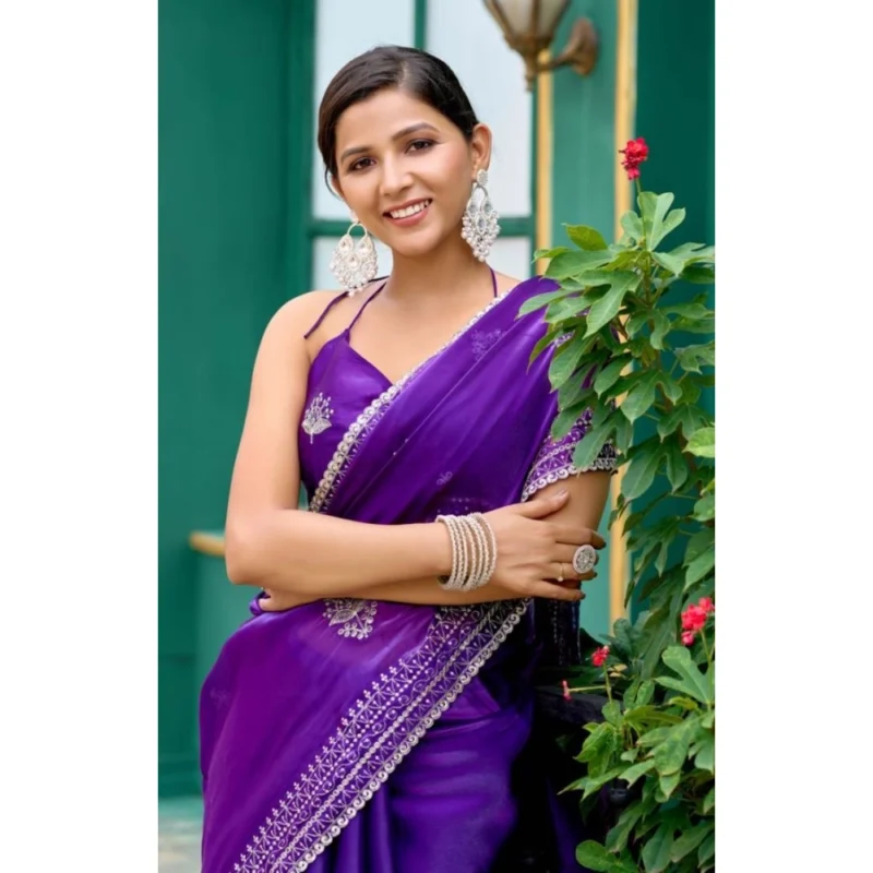 Women’s Faux Shimmer Floral Embroidery Ready to wear Saree With Unstitched Blouse 5.5Mtr (Purple)