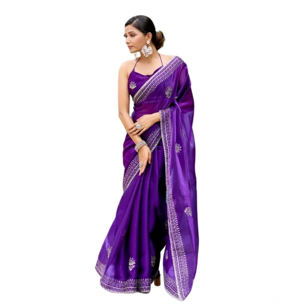 Women's Faux Shimmer Floral Embroidery Ready to wear Saree With Unstitched Blouse 5.5Mtr (Purple)