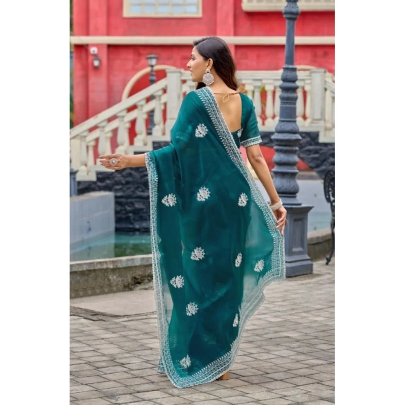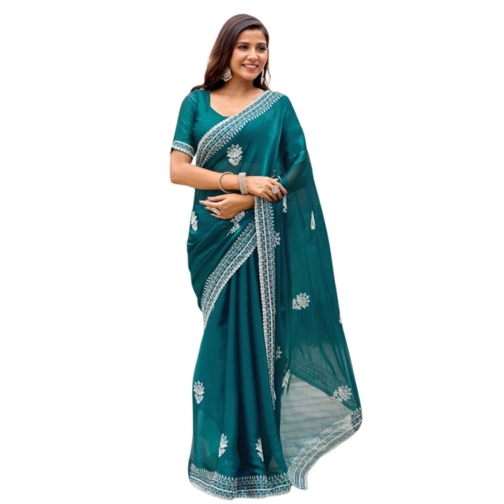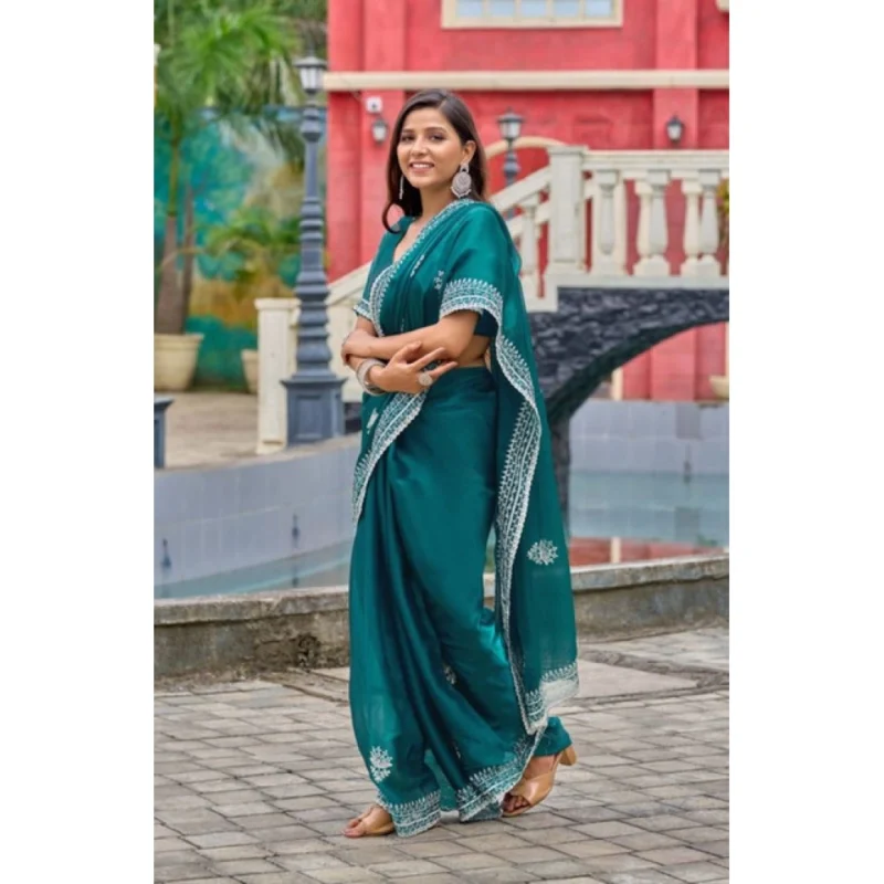 Women's Faux Shimmer Floral Embroidery Ready to wear Saree With Unstitched Blouse 5.5Mtr (Teal)