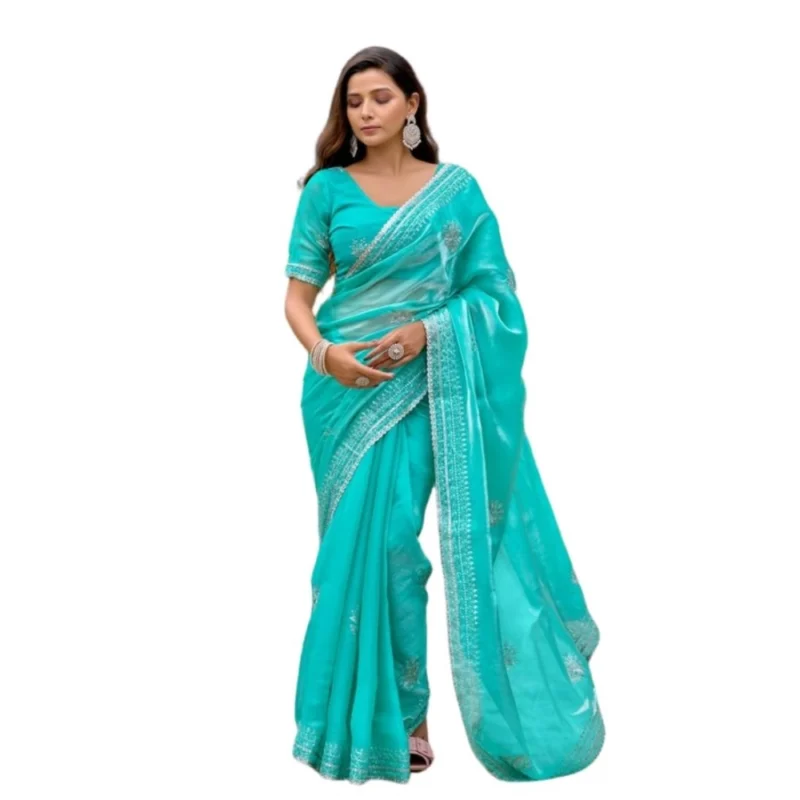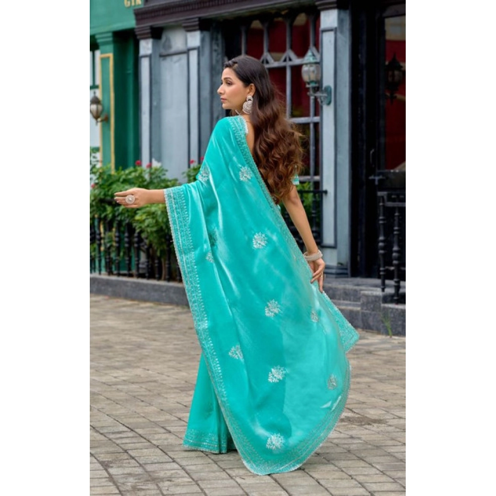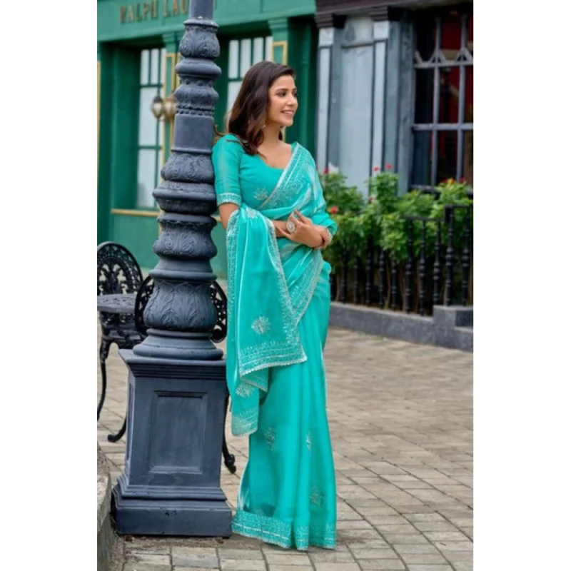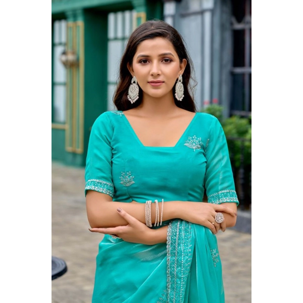 Women's Faux Shimmer Floral Embroidery Ready to wear Saree With Unstitched Blouse 5.5Mtr (Turquoise)