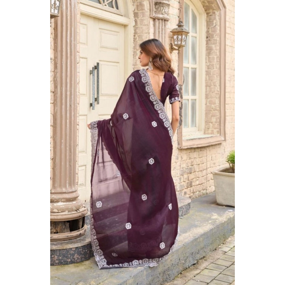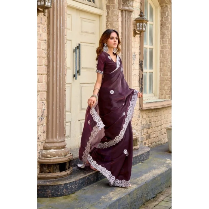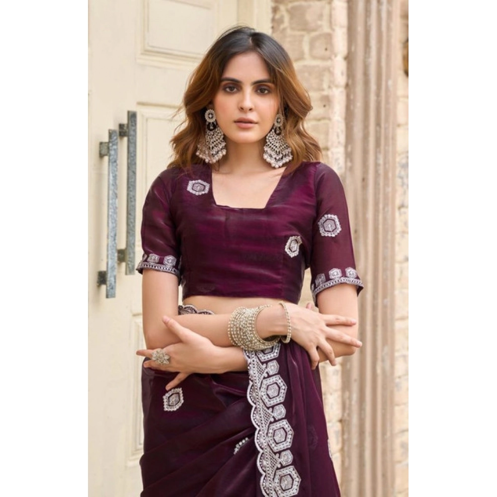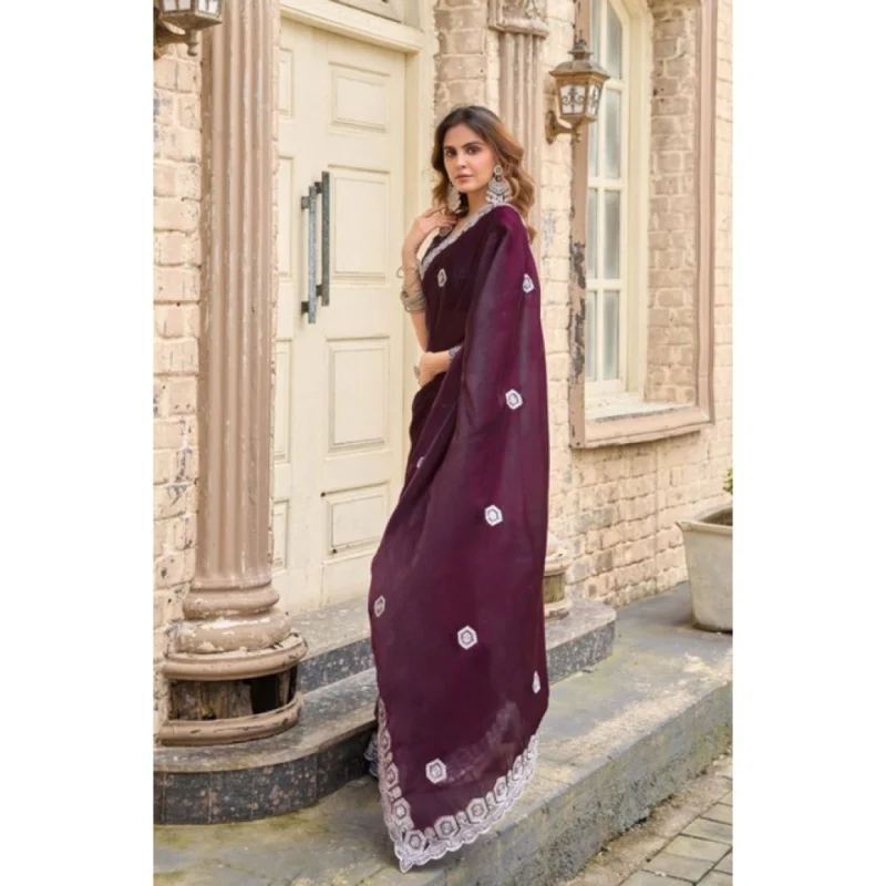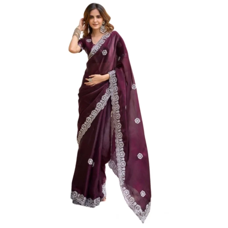 Women's Faux Shimmer Geometric Ready to wear Saree With Unstitched Blouse 5.5Mtr (Wine)