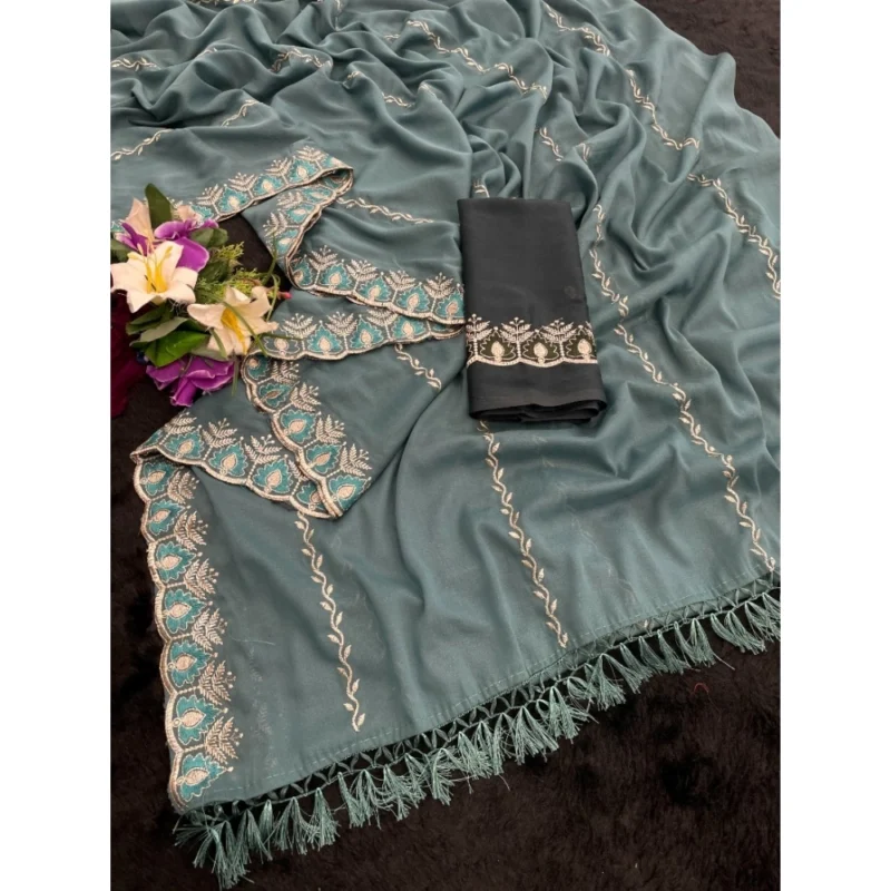 Women’s Georgette Embroidered Saree With Unstitched Blouse 5.5Mtr (Blue)