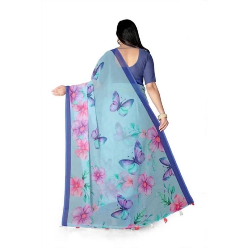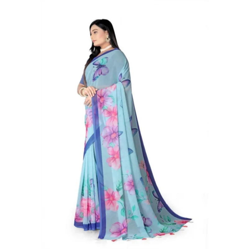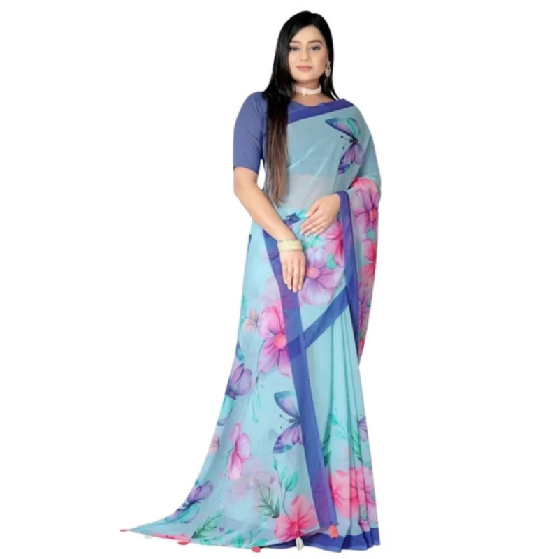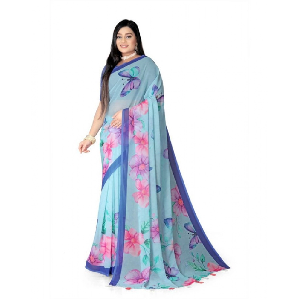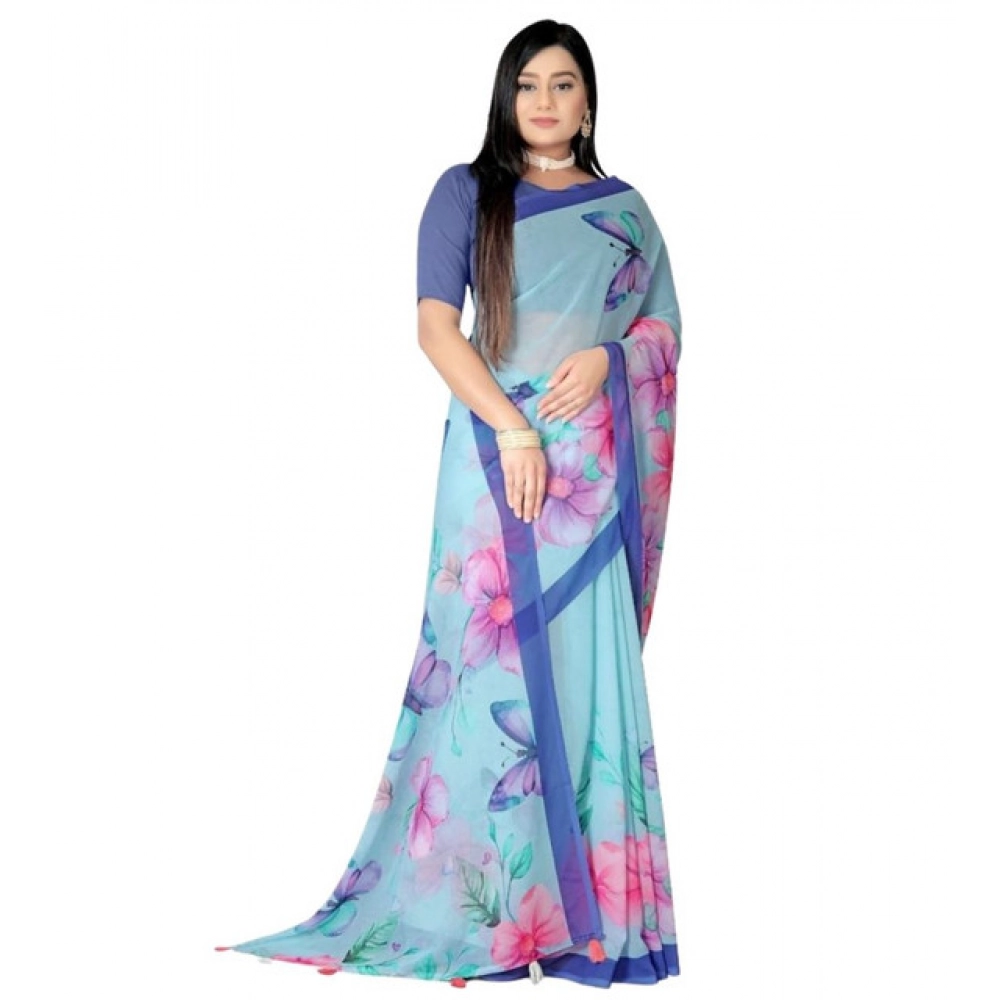 Women's Georgette Floral Printed Saree With Unstitched Blouse 5.5Mtr (Blue)