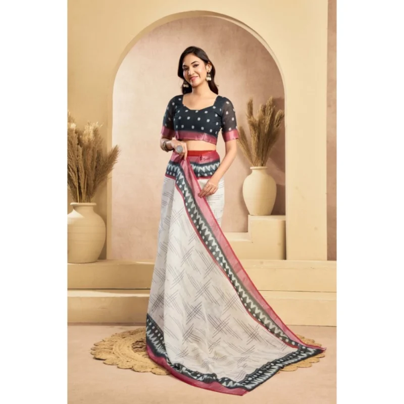 Women's Linen Cotton Printed Ready To Wear Saree With Unstitched Blouse 5.5 Mtr (Off_White)