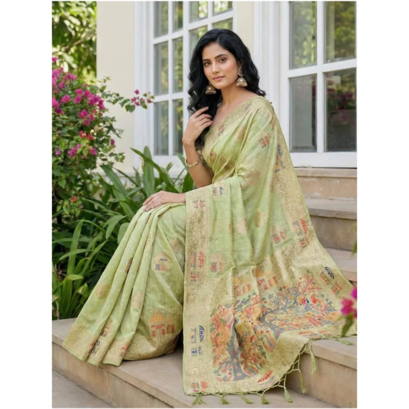 Women's Linen Cotton Printed Saree With Unstitched Blouse 5.5Mtr (Light Green)