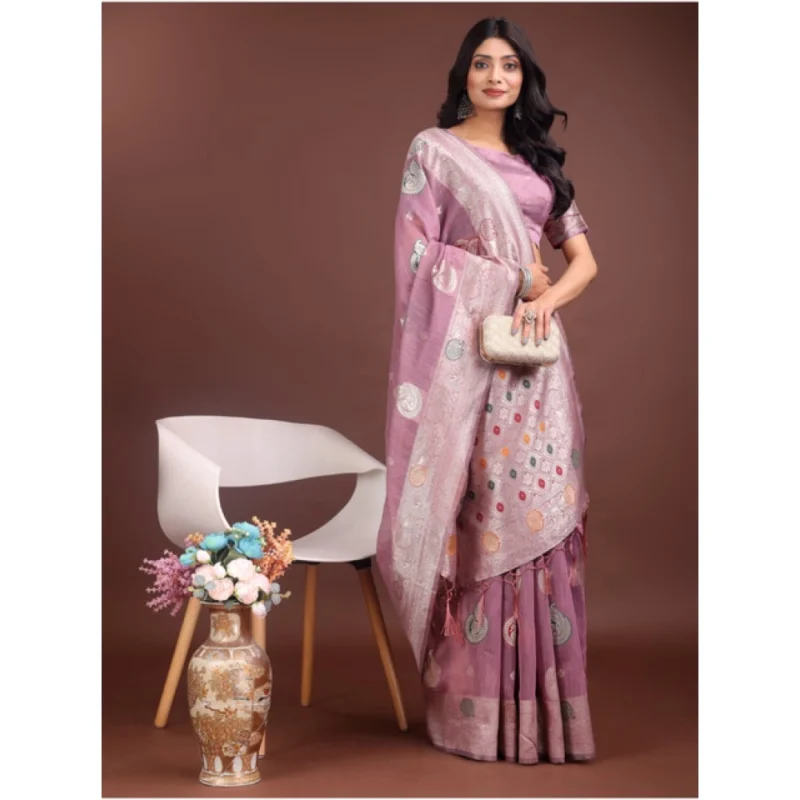 Women's Linen Cotton Printed Saree With Unstitched Blouse 5.5Mtr (Purple)