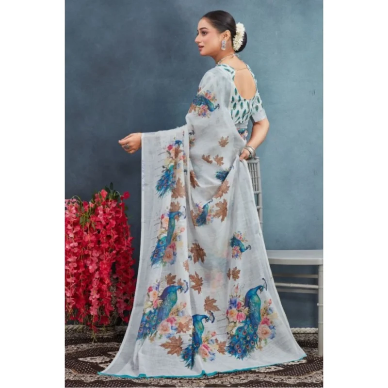 Women’s Linen Floral Printed Saree With Unstitched Blouse