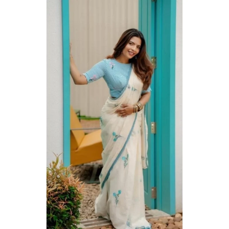 Women’s Linen Printed Saree With Unstitched Blouse 5.5Mtr
