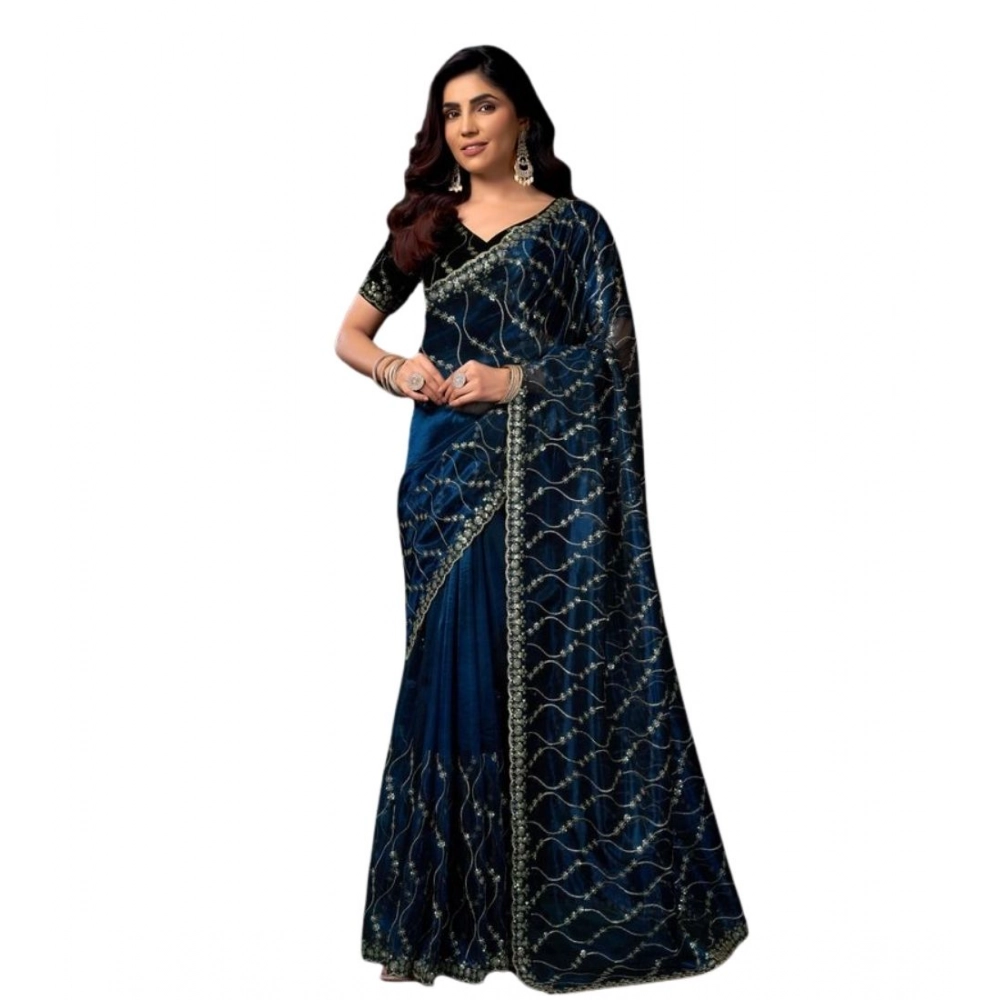Women's Net Sequence Saree With Unstitched Blouse 5.5Mtr (Blue)