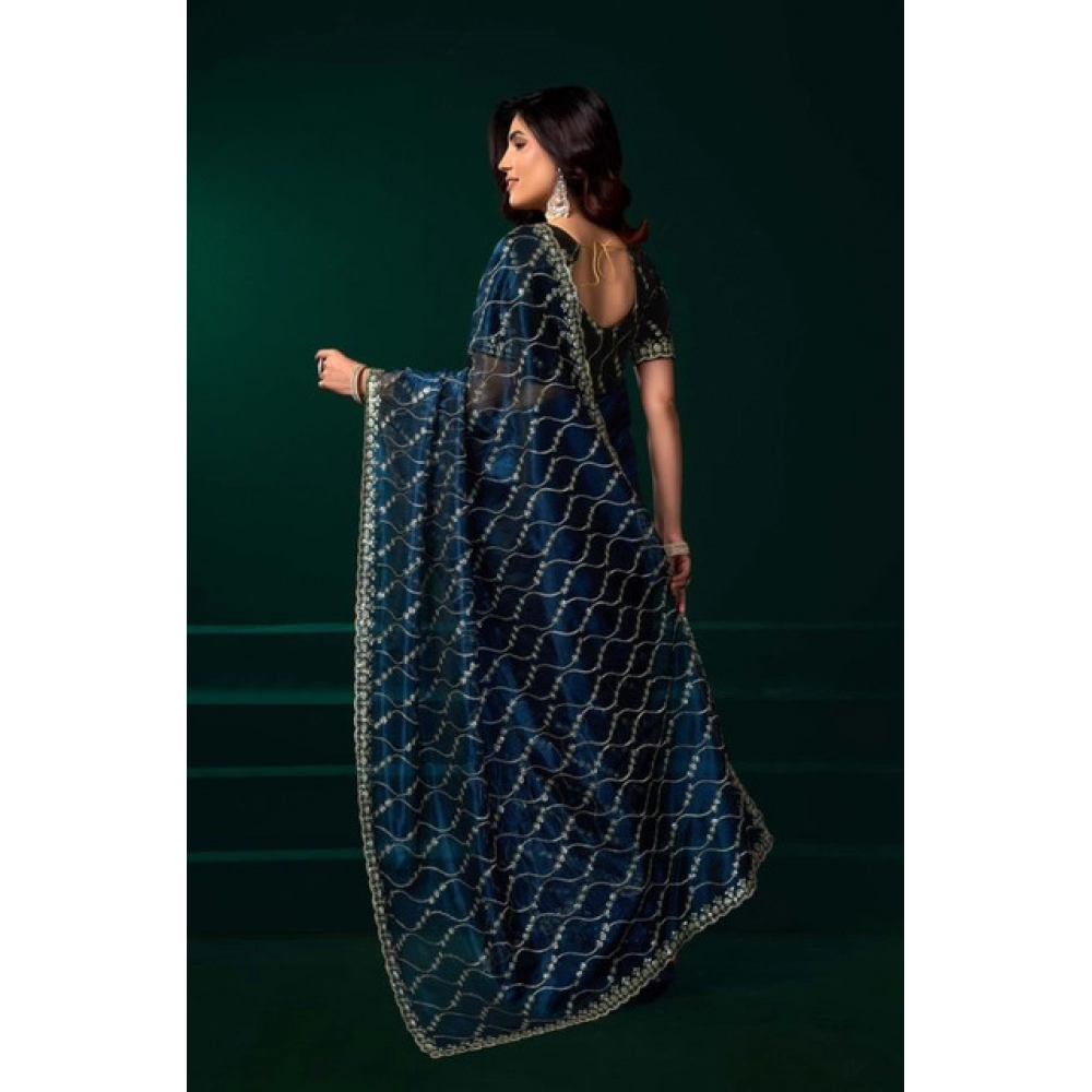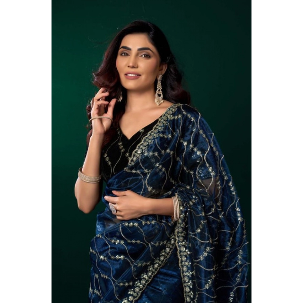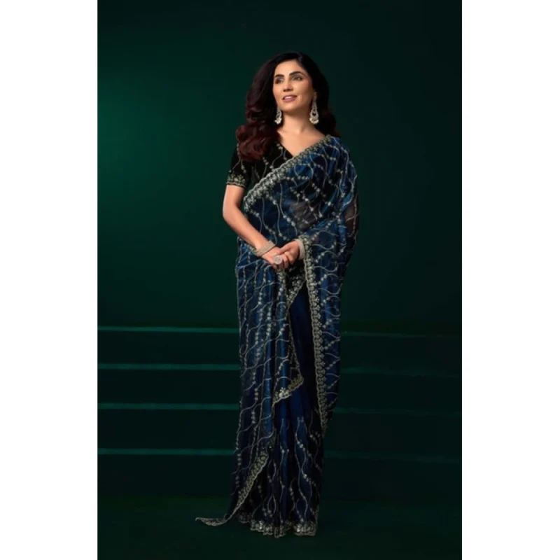 Women’s Net Sequence Saree With Unstitched Blouse 5.5Mtr (Blue)