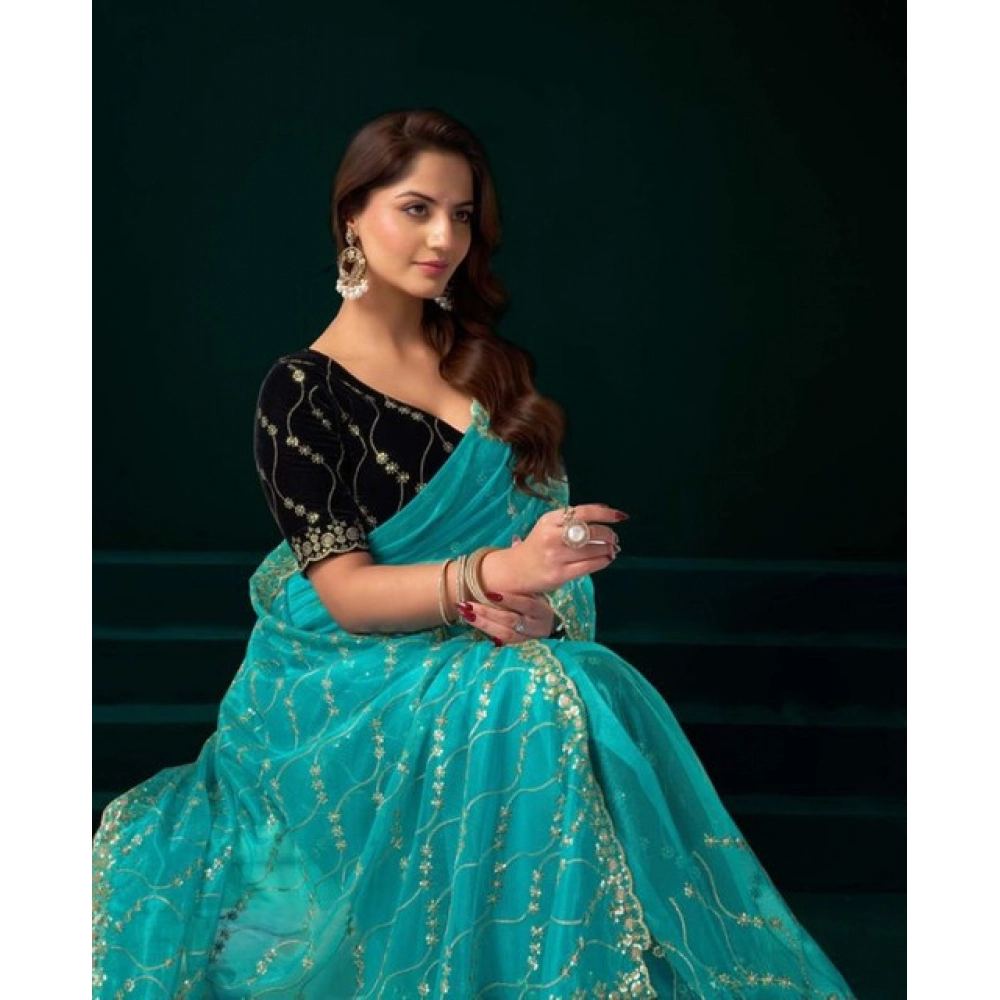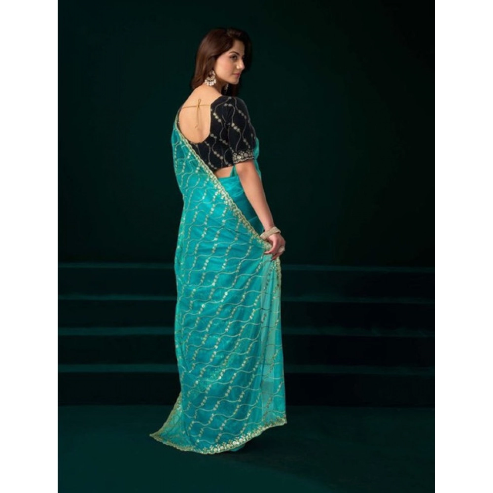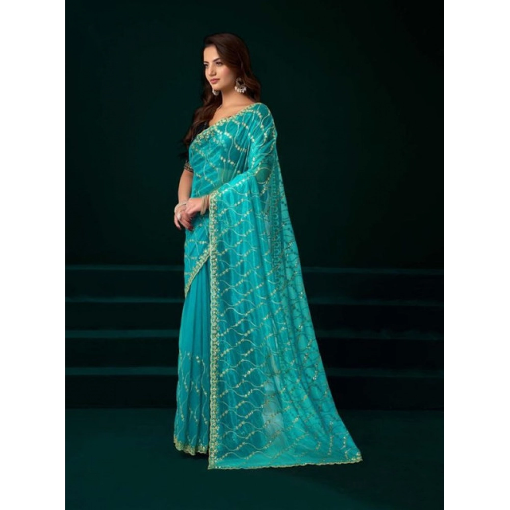 Women’s Net Sequence Saree With Unstitched Blouse 5.5Mtr (Turquoise)