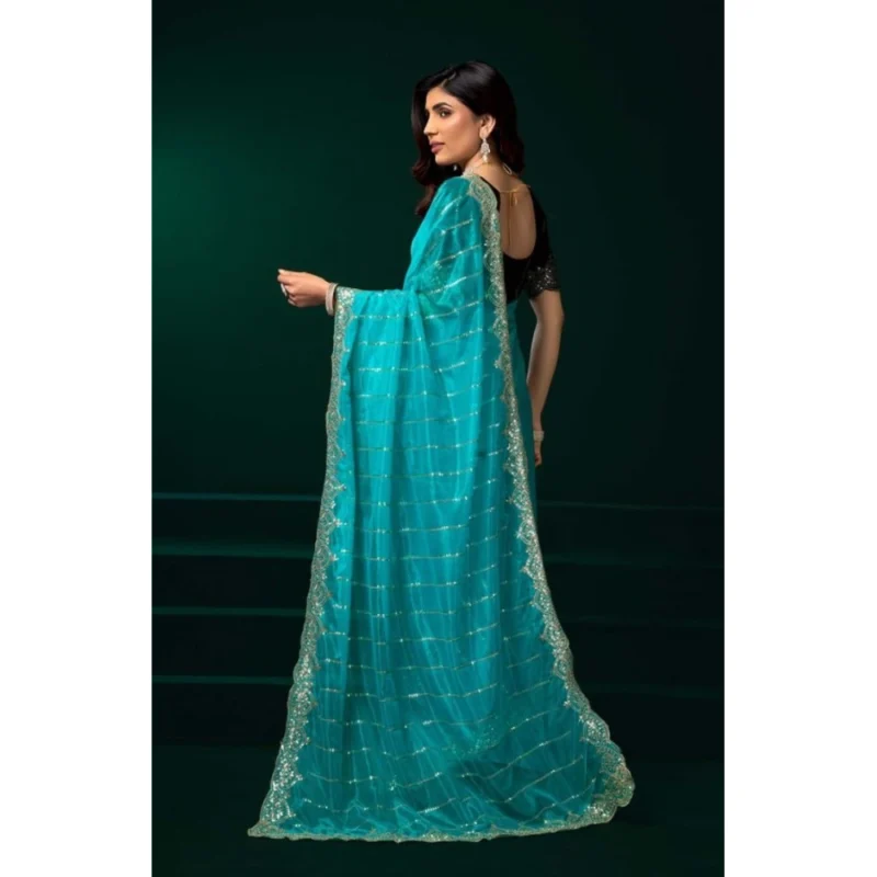 Women’s Net Sequence Saree With Unstitched Blouse 5.5Mtr (Turquoise)