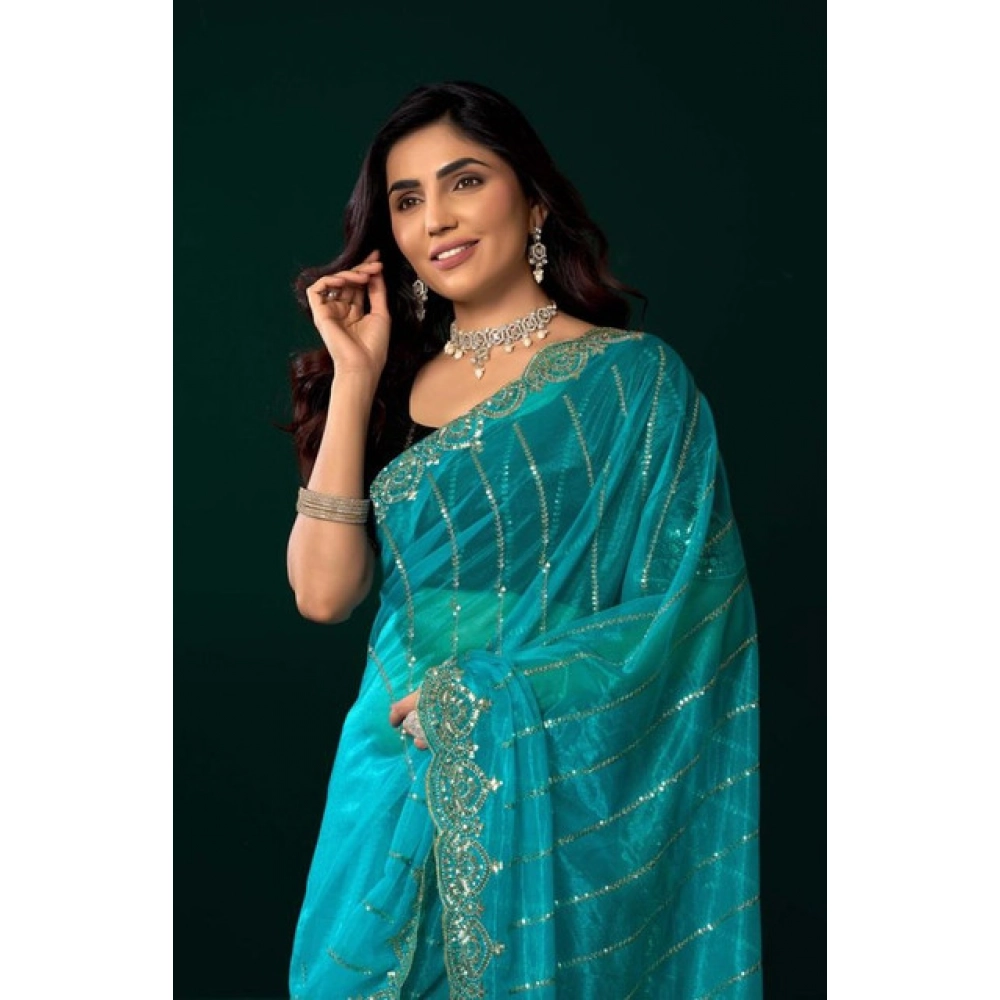 Women's Net Sequence Saree With Unstitched Blouse 5.5Mtr (Turquoise)