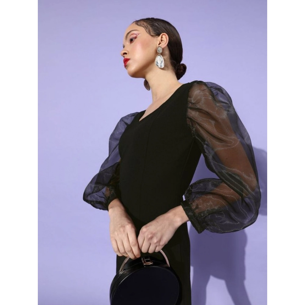 Women’s Organza And Polyester Lycra Solid Long Sleeves Dress (Black)