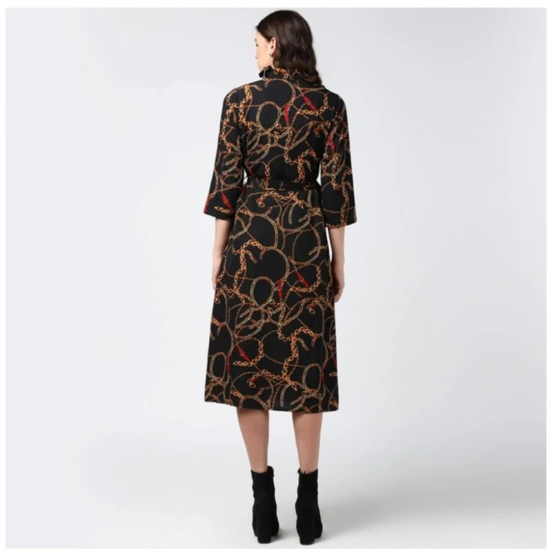 Women’s Polyester Chain Print Roll Up Sleeve Below Knee Dress
